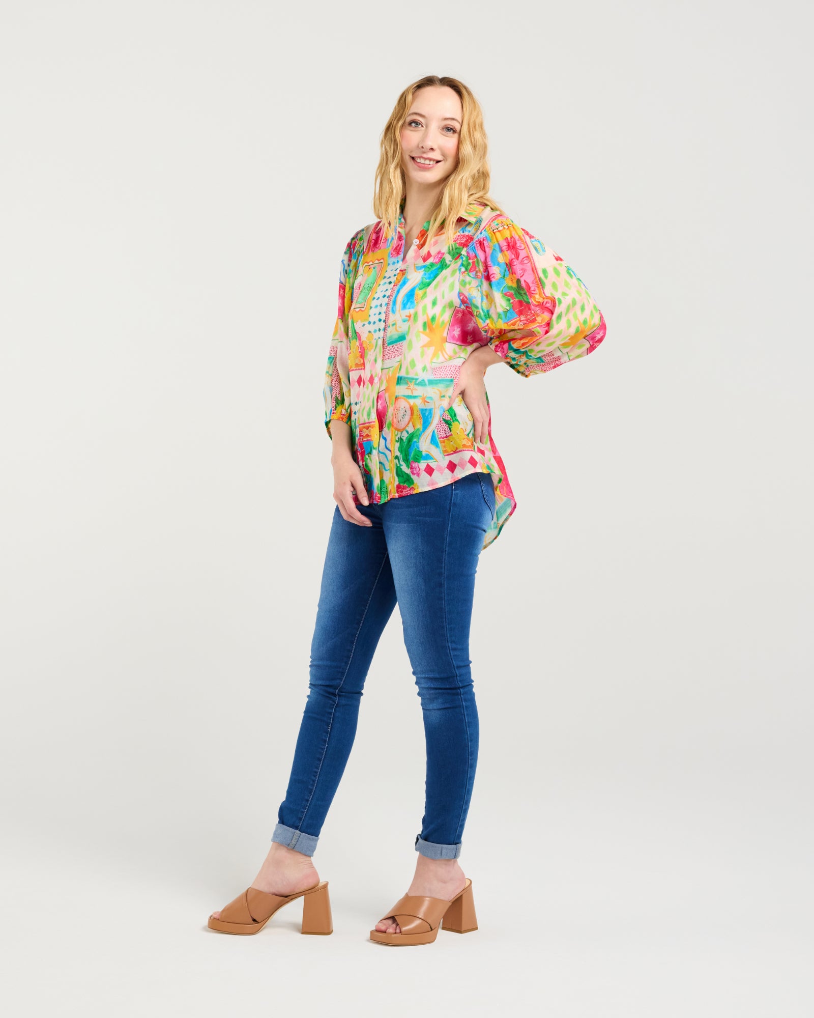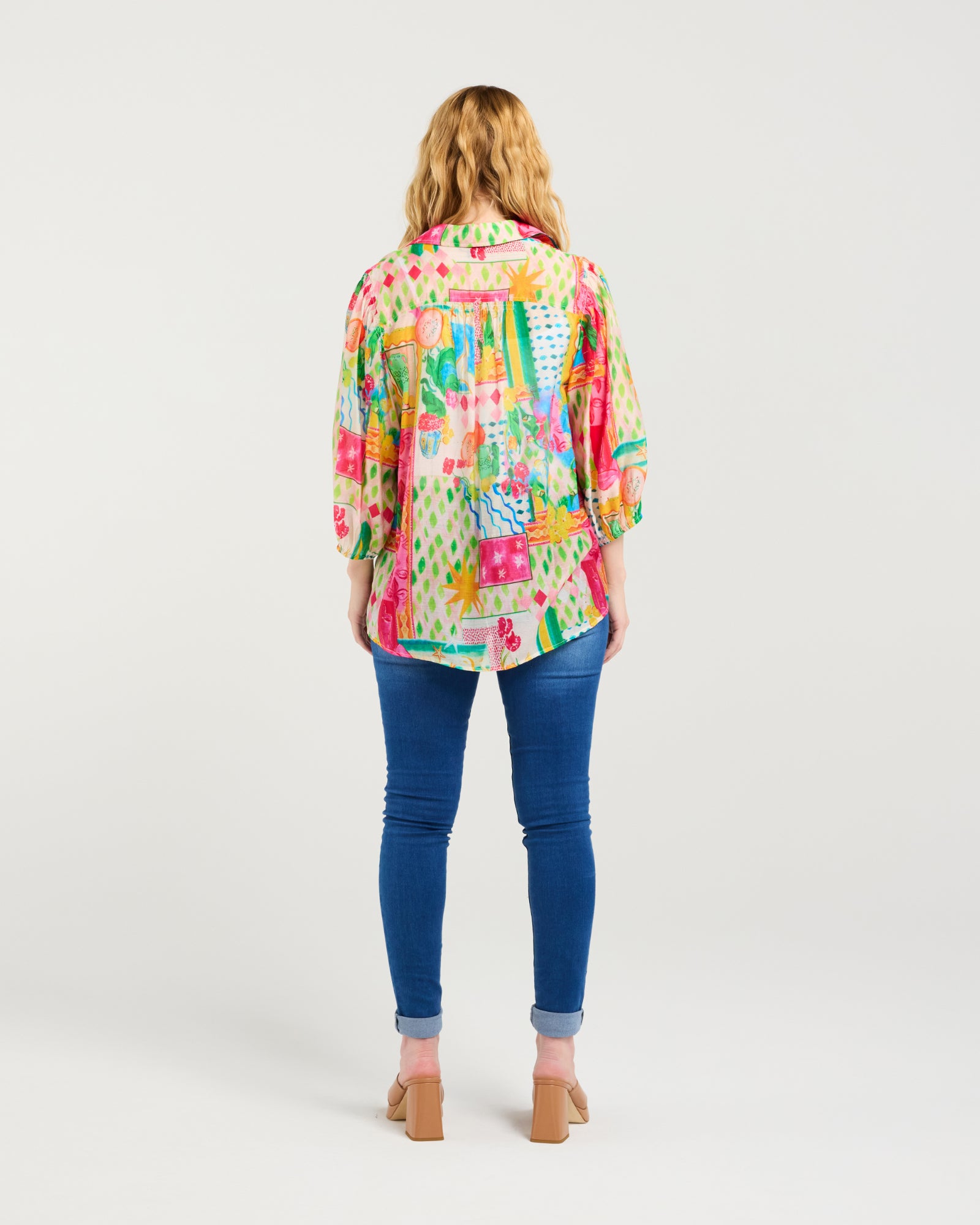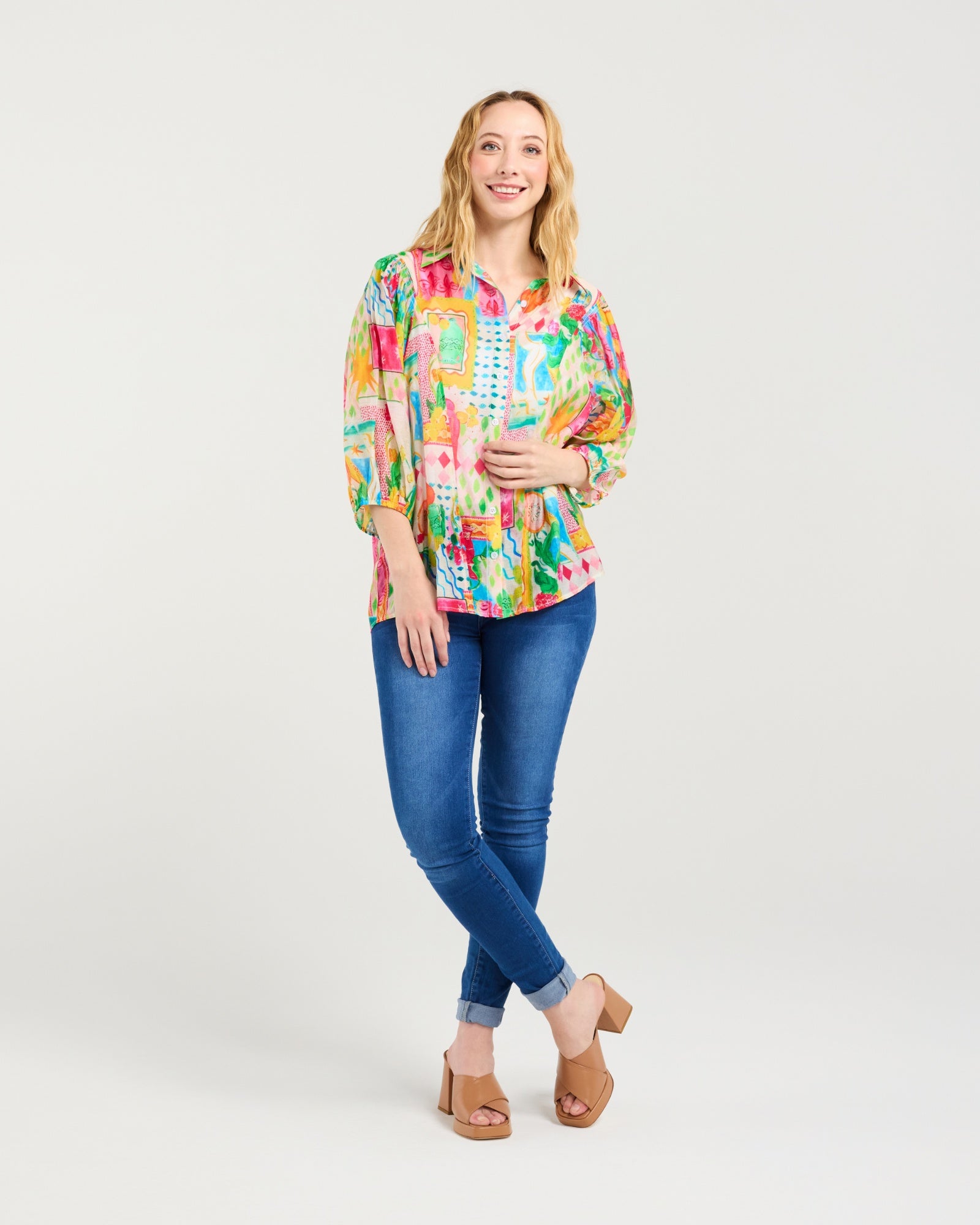 This shirt features a bold-look colourful fabric with a button-down collar neckline and elasticated puff sleeves that reach the elbow, combining classic charm with a touch of modern comfort.
