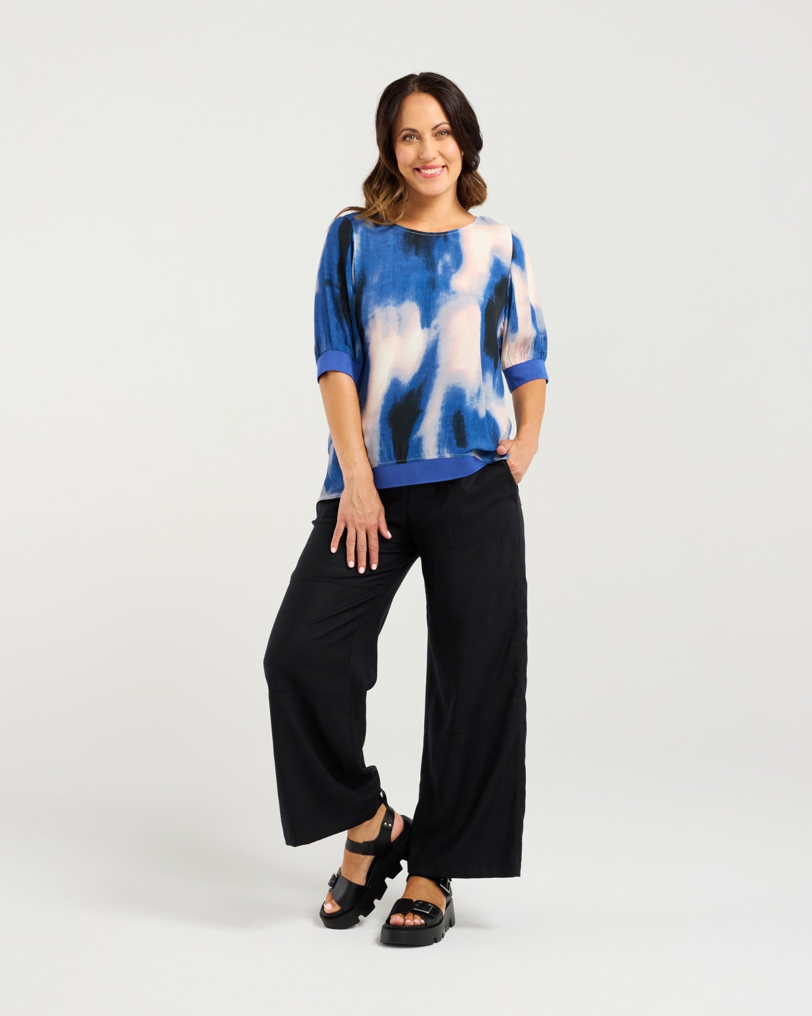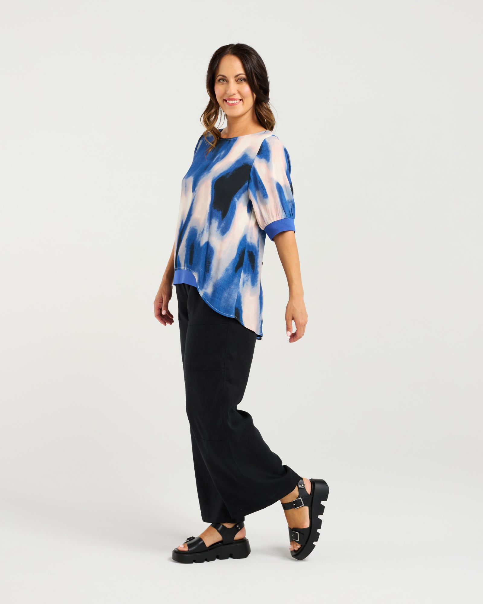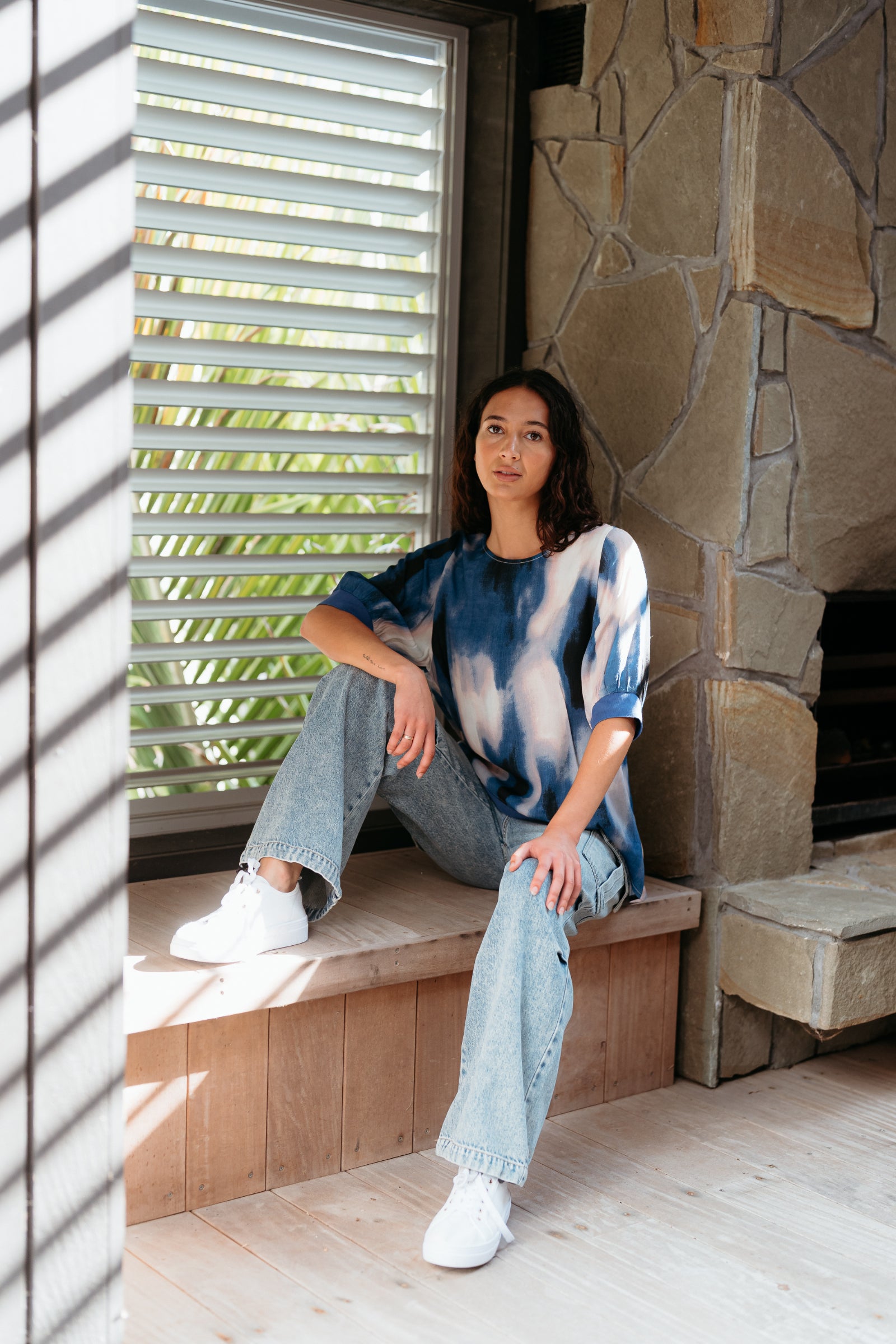 Our stylish basic reimagined in the seasonal colours and prints. Features elbow length sleeves, rib cuffs, and a ribbed hem. The front hem rests at waist length, while the back hem is rounded and falls below the hips, creating a chic and flattering look.