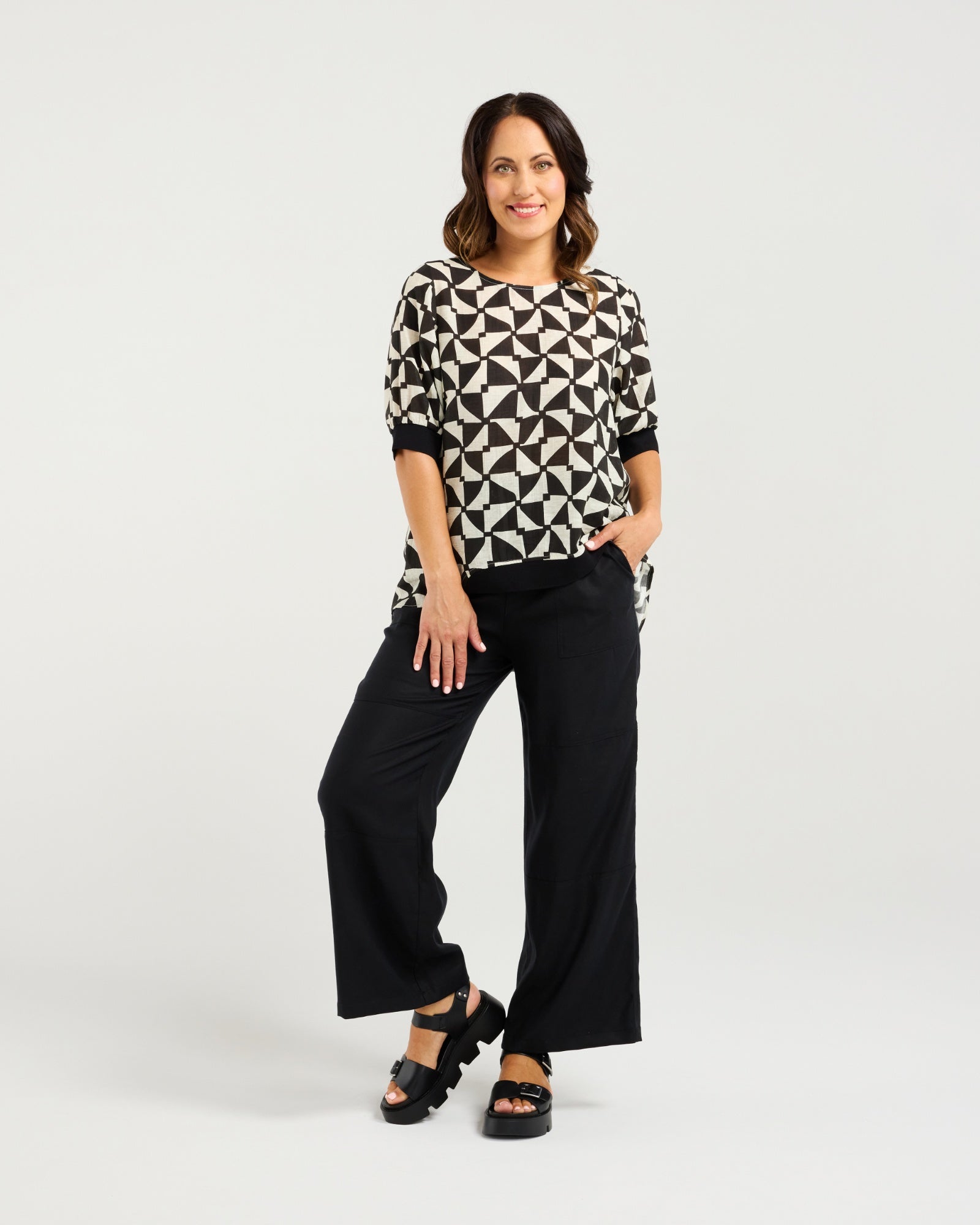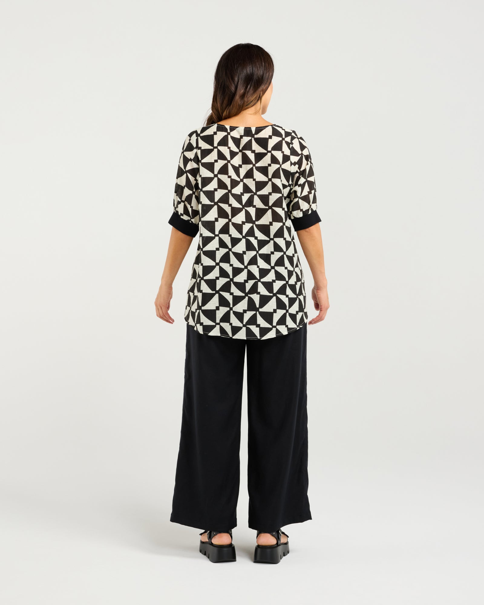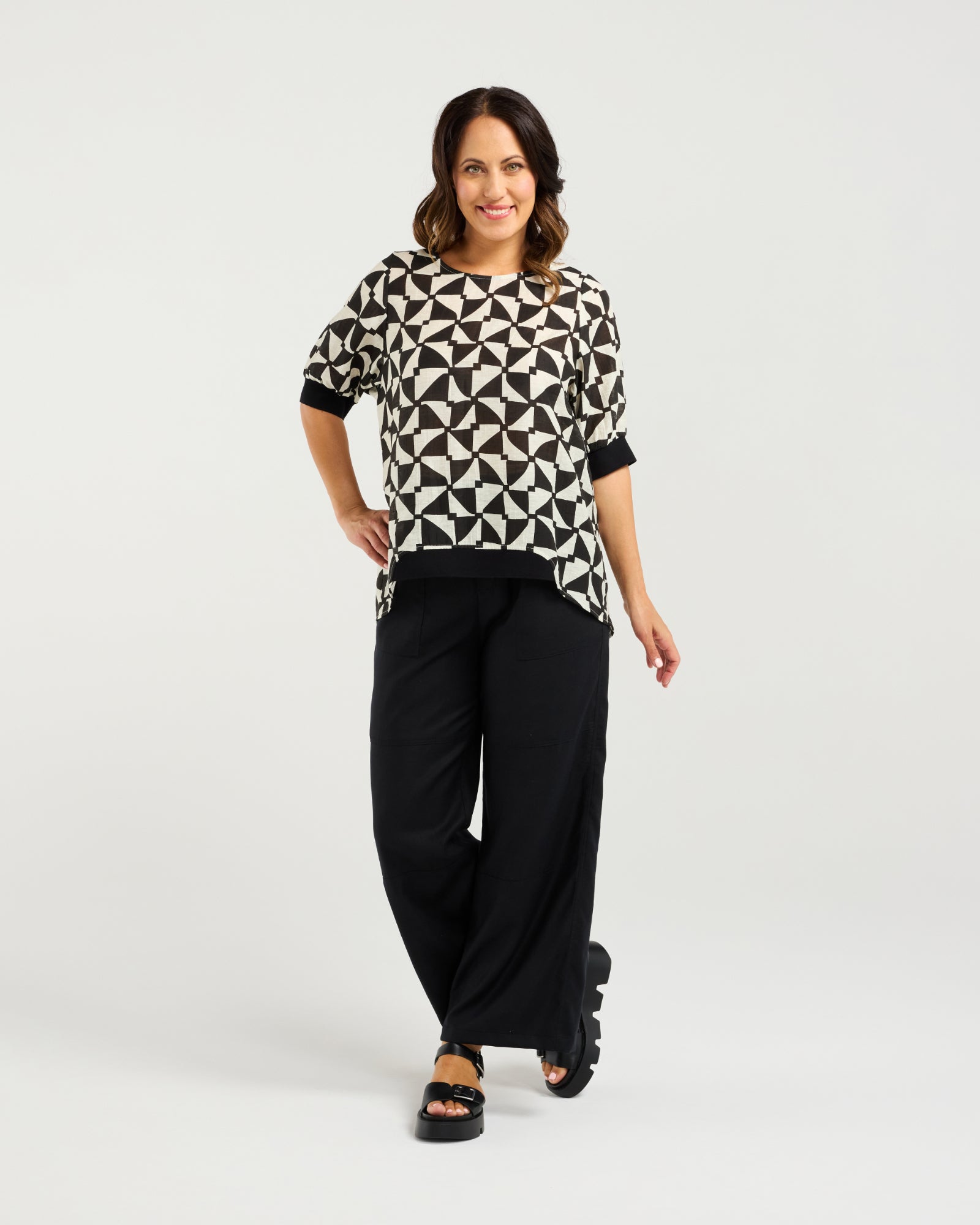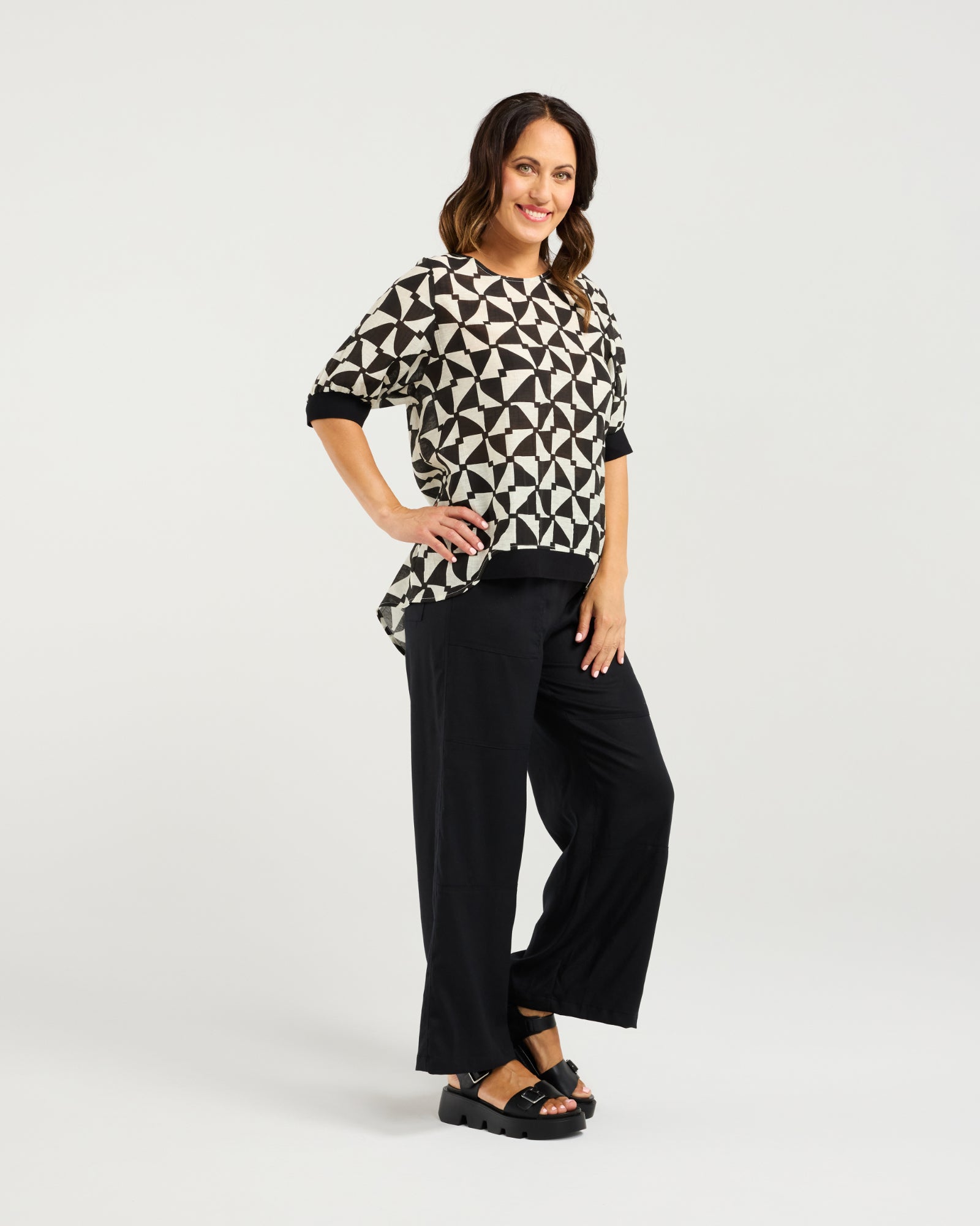 Our stylish basic reimagined in the seasonal colours and prints.  Features elbow length sleeves, rib cuffs, and a ribbed hem. The front hem rests at waist length, while the back hem is rounded and falls below the hips, creating a chic and flattering look.