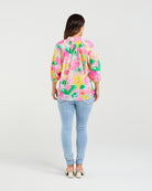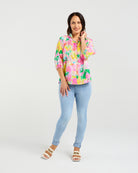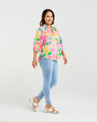This vibrant shirt features a band collar and button-down front for a clean, modern look. The elasticated sleeves fall just below the elbow, perfectly complementing the colorful printed fabric for an effortlessly stylish finish.