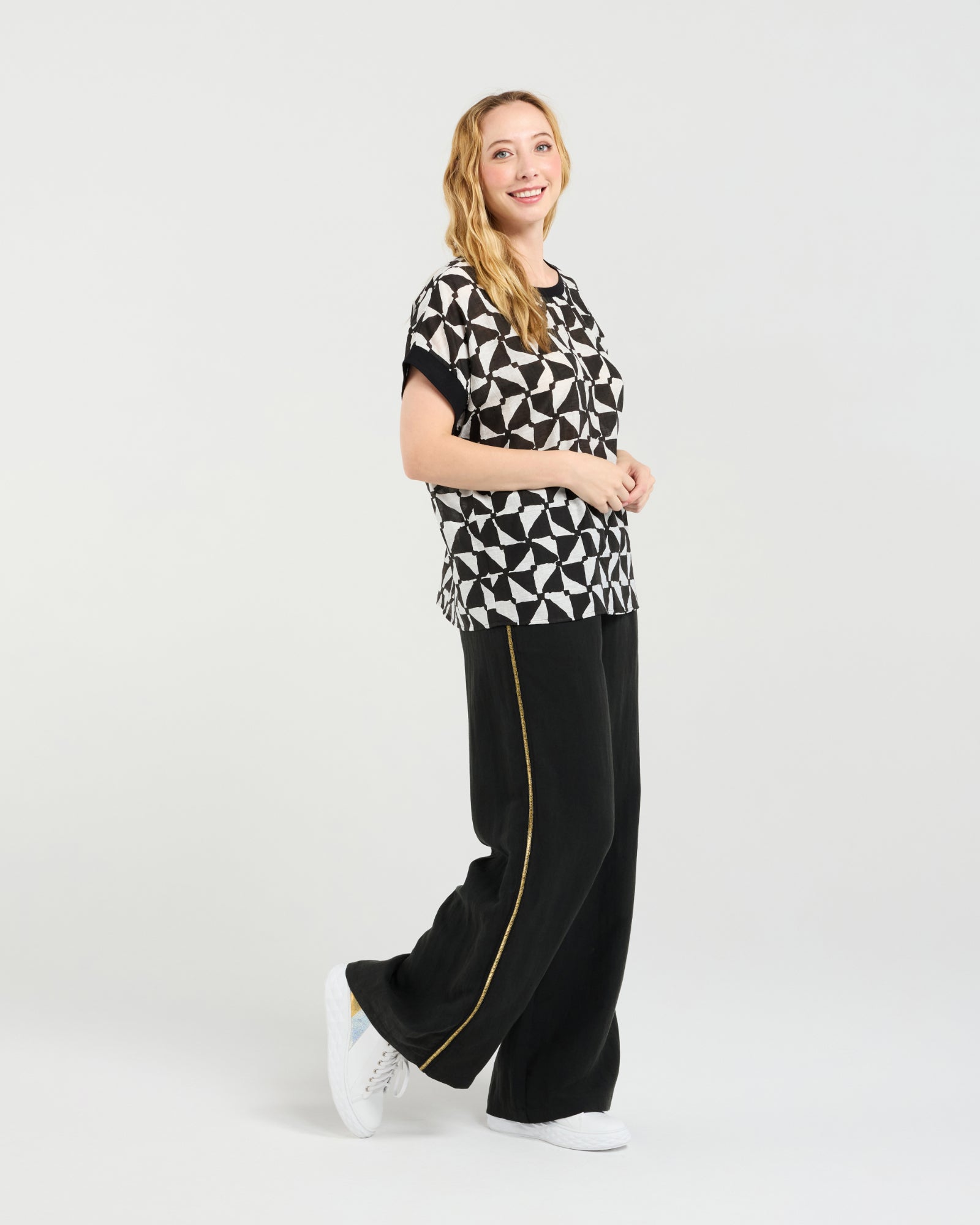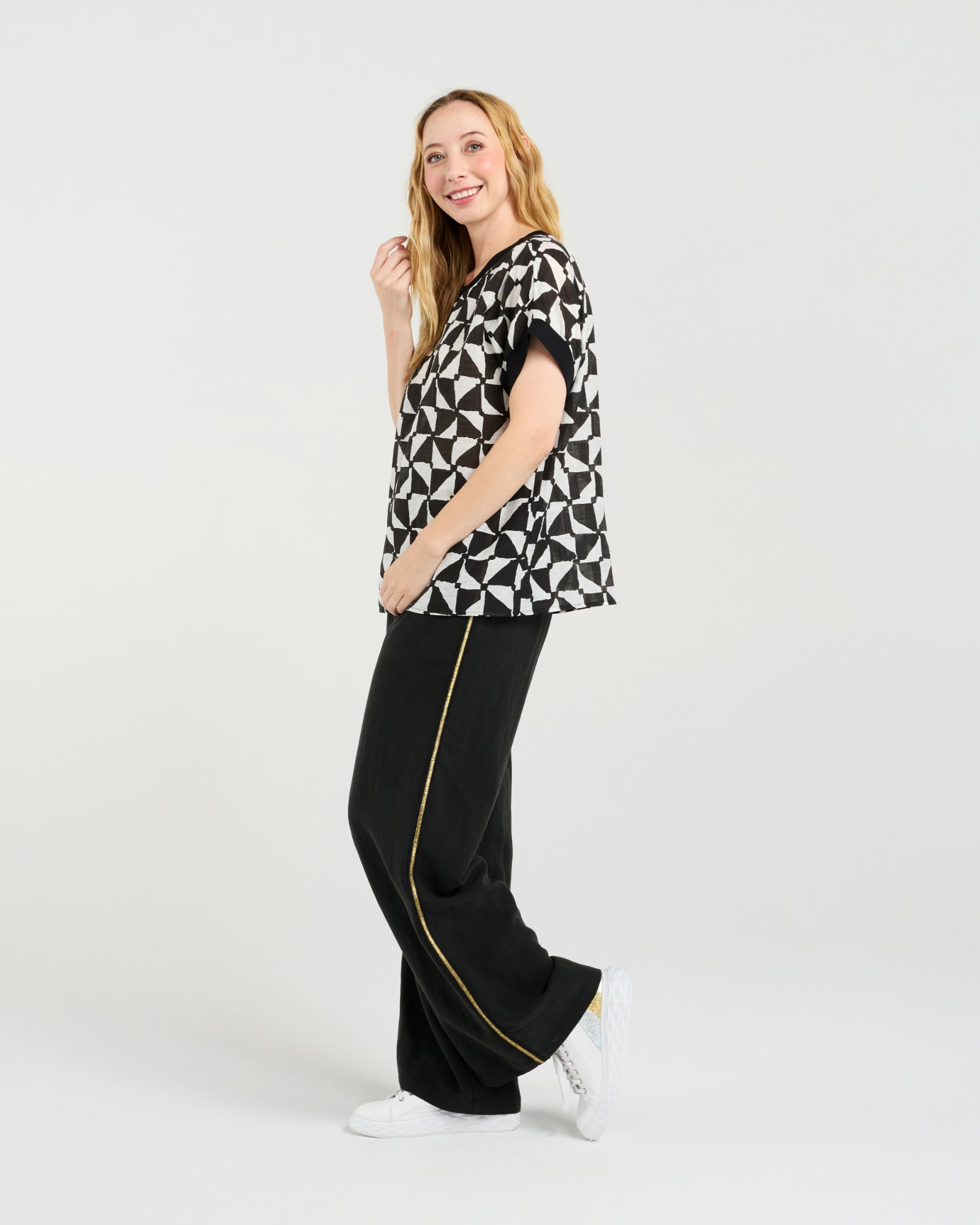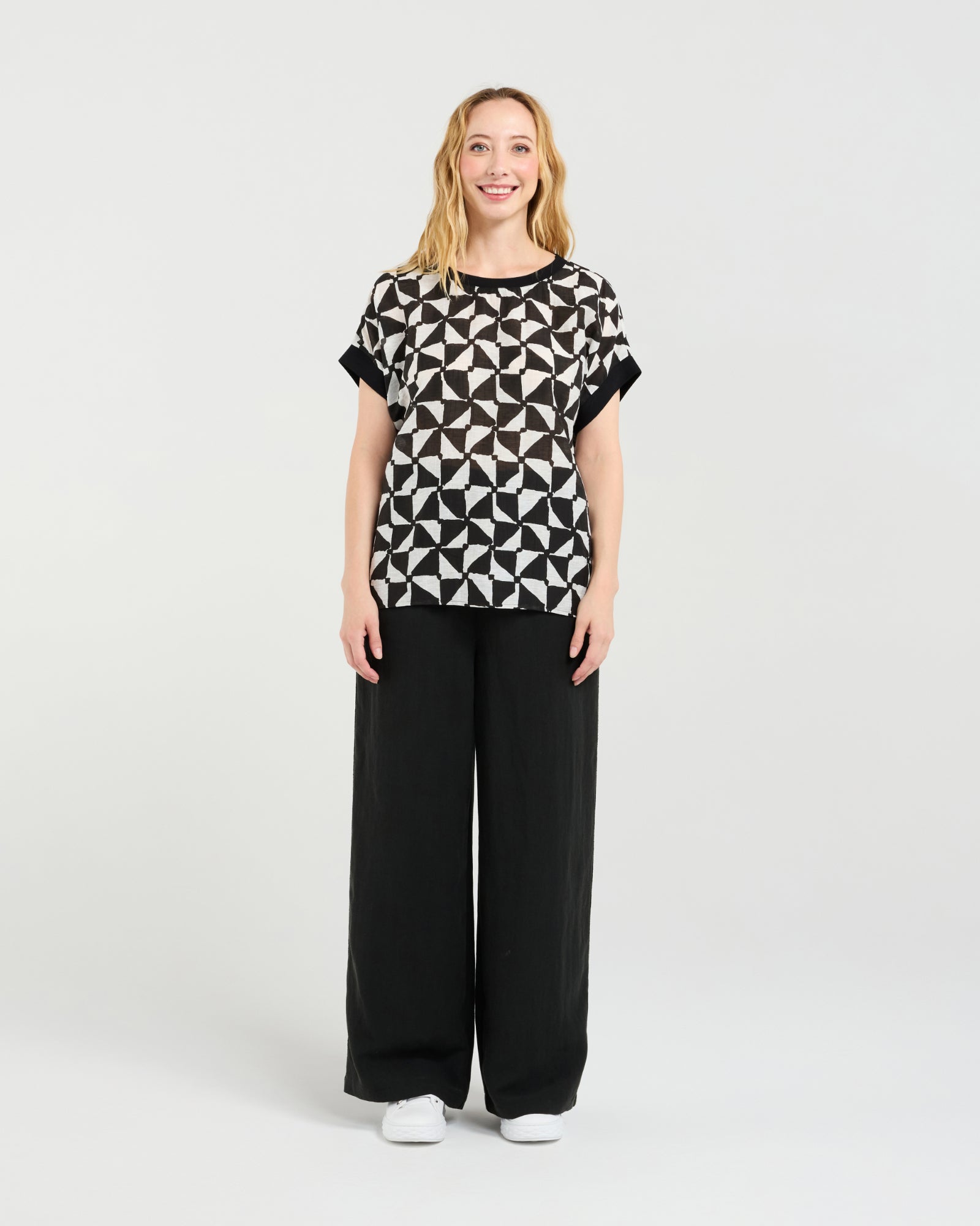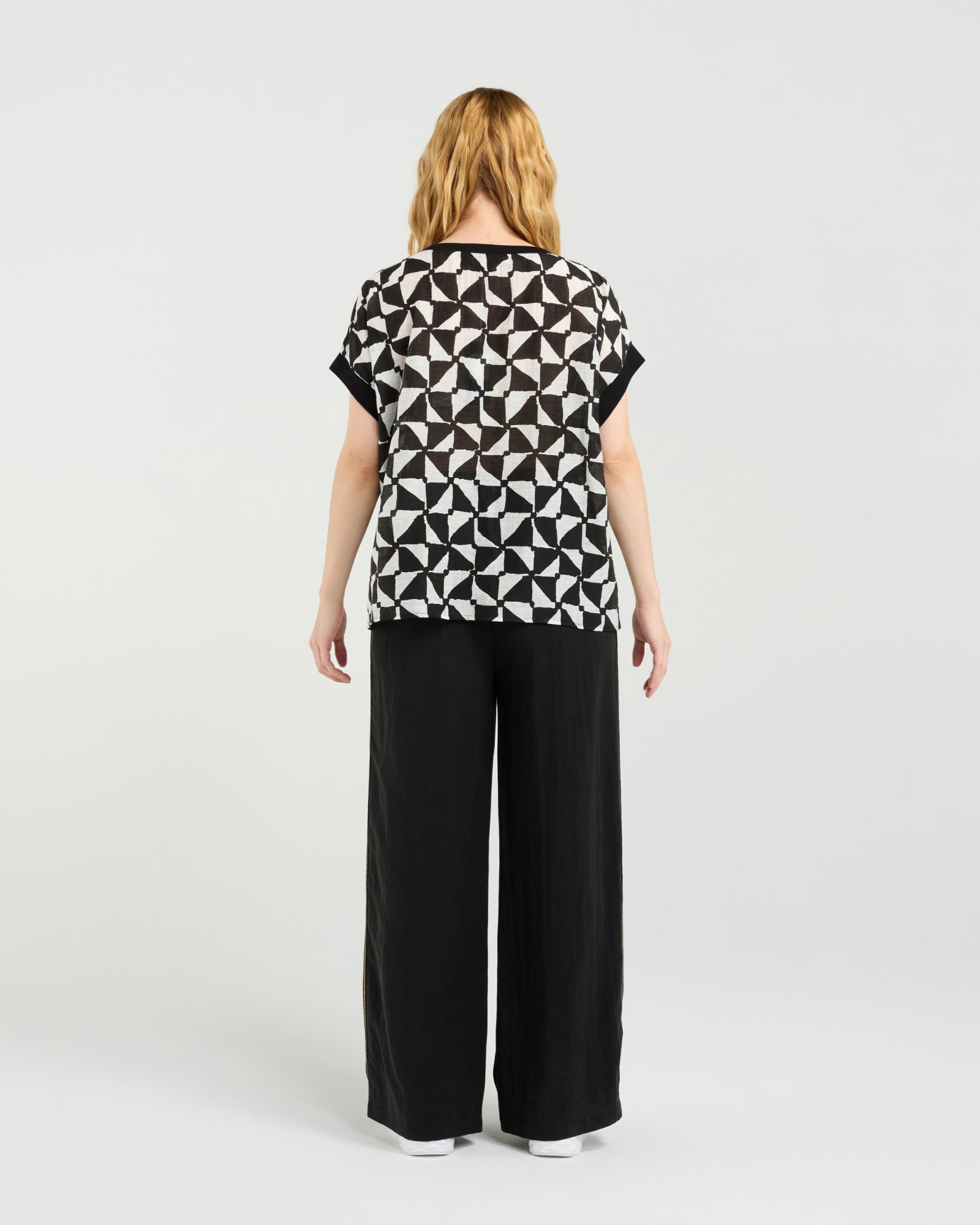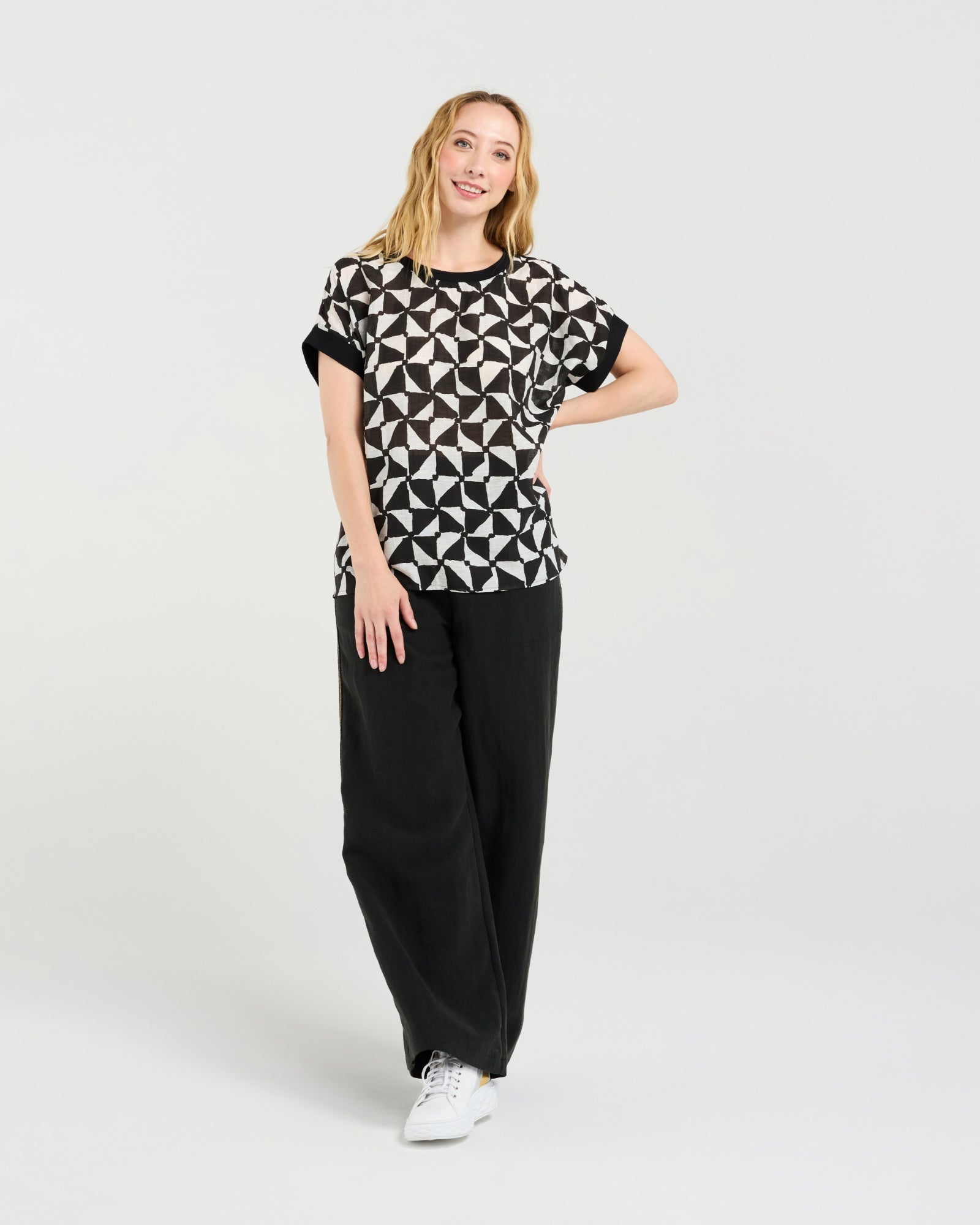 A monochrome moment with maximum impact — this relaxed-fit t-shirt features an abstract black and white print for a bold yet versatile look. Ribbed sleeve bands and a matching neckline add a refined finish to the easy silhouette.