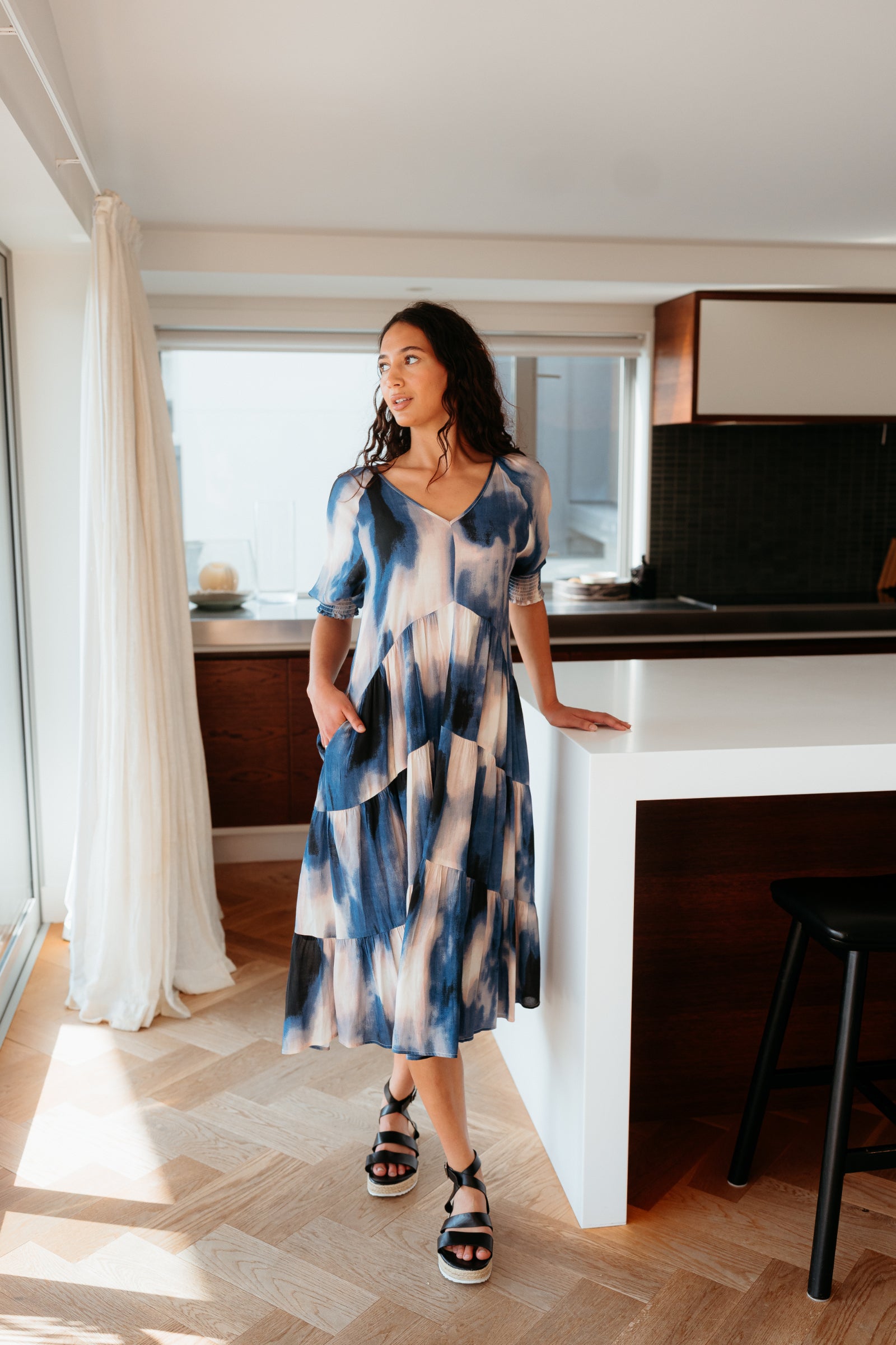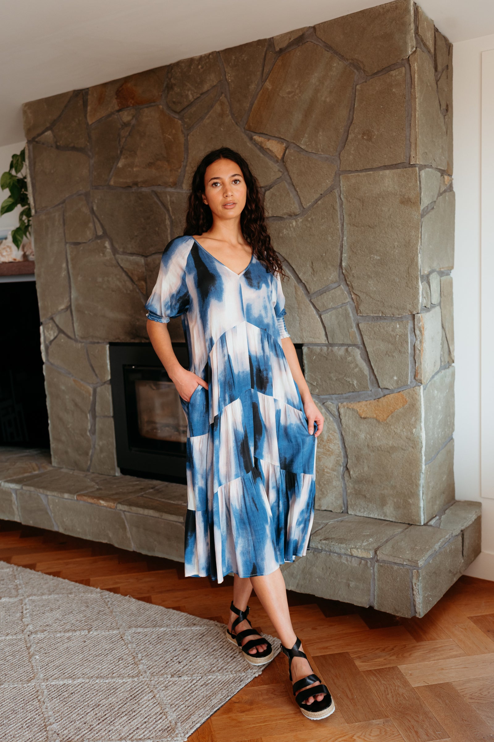 Introducing this stunning midi dress, a fusion of elegance and modern flair. Crafted in a captivating blue abstract print, this dress embodies artistic charm and sophistication. The V-neckline adds a touch of allure, perfectly complemented by the graceful 3/4 sleeves with elasticated cuffs, offering both comfort and style.