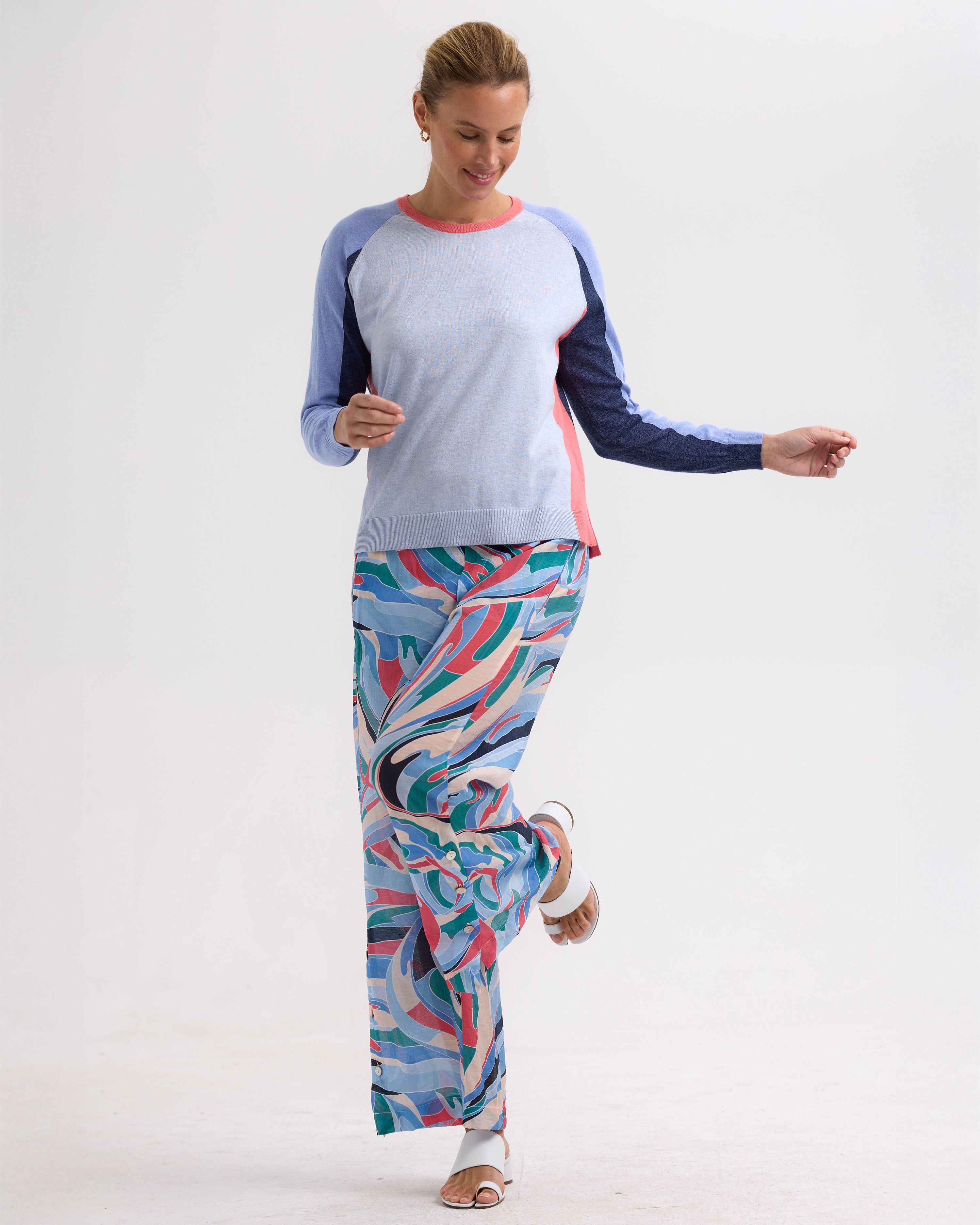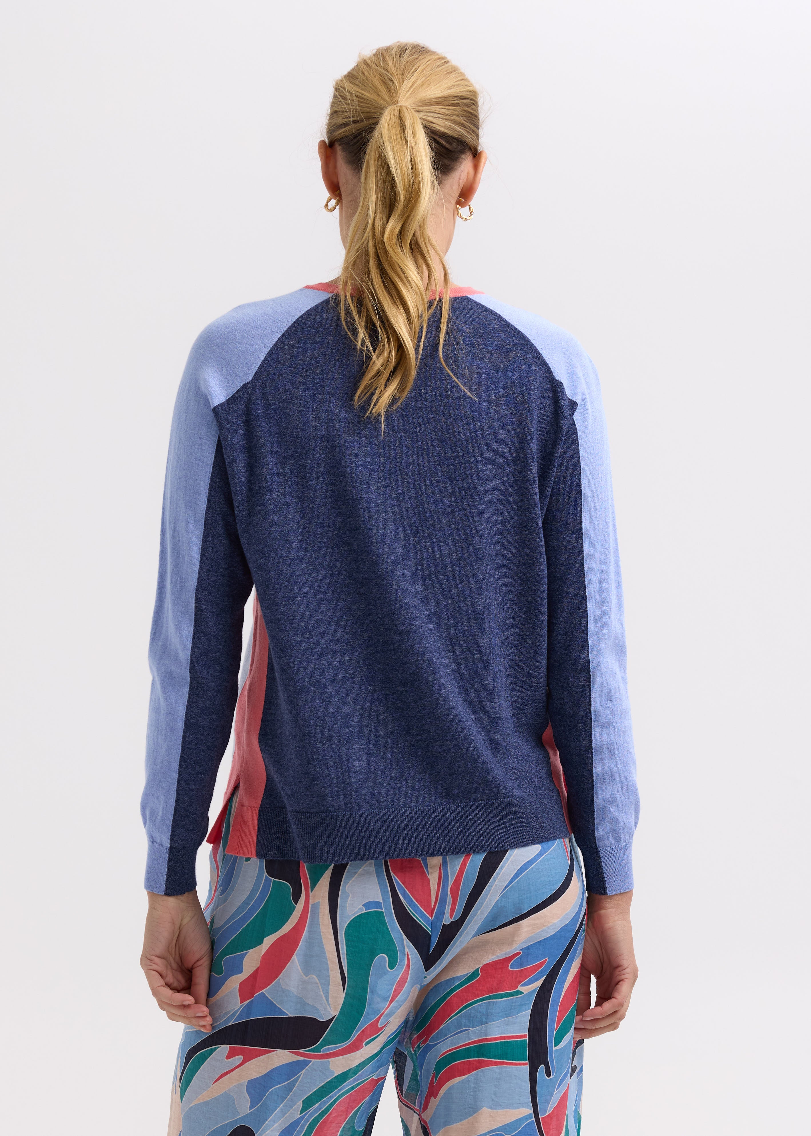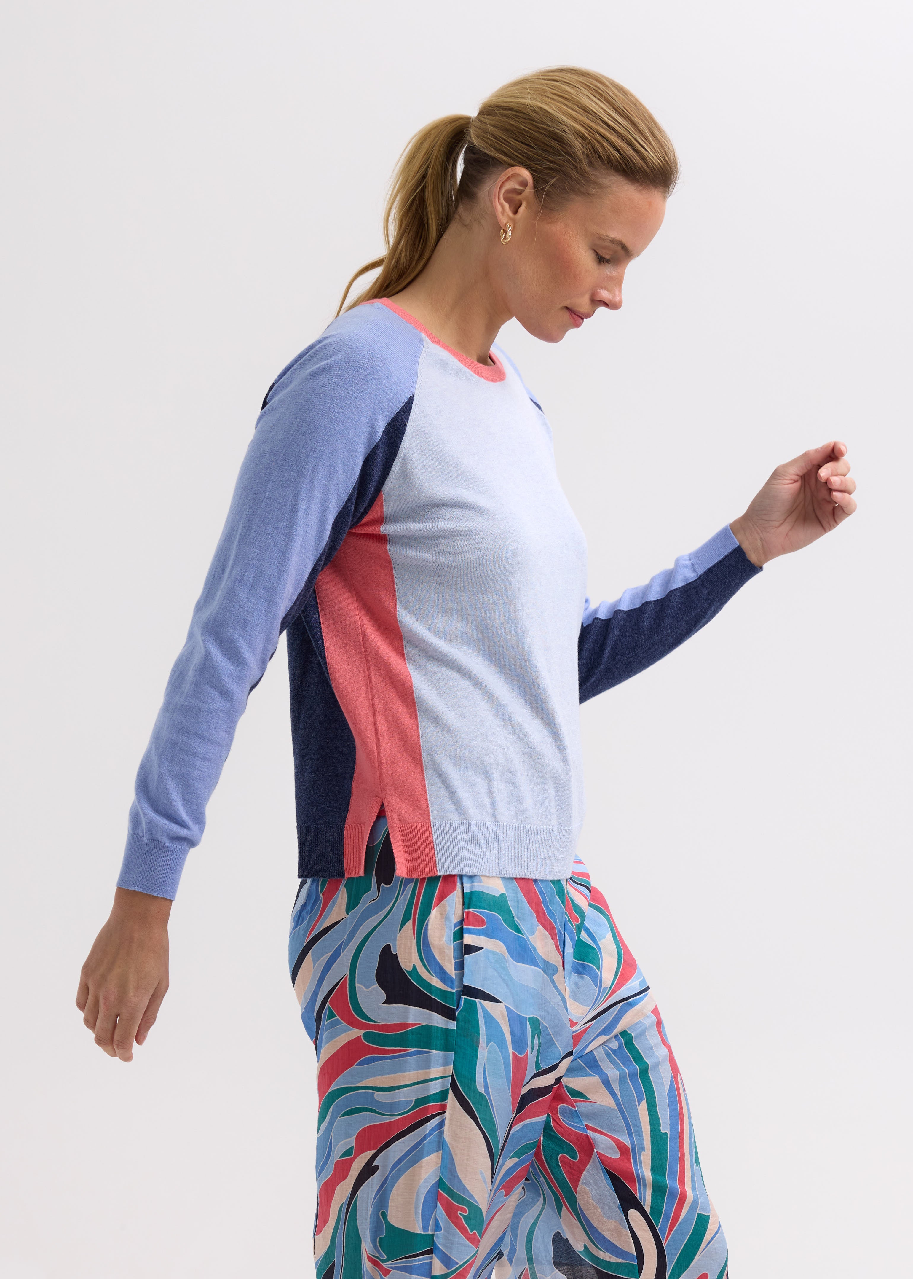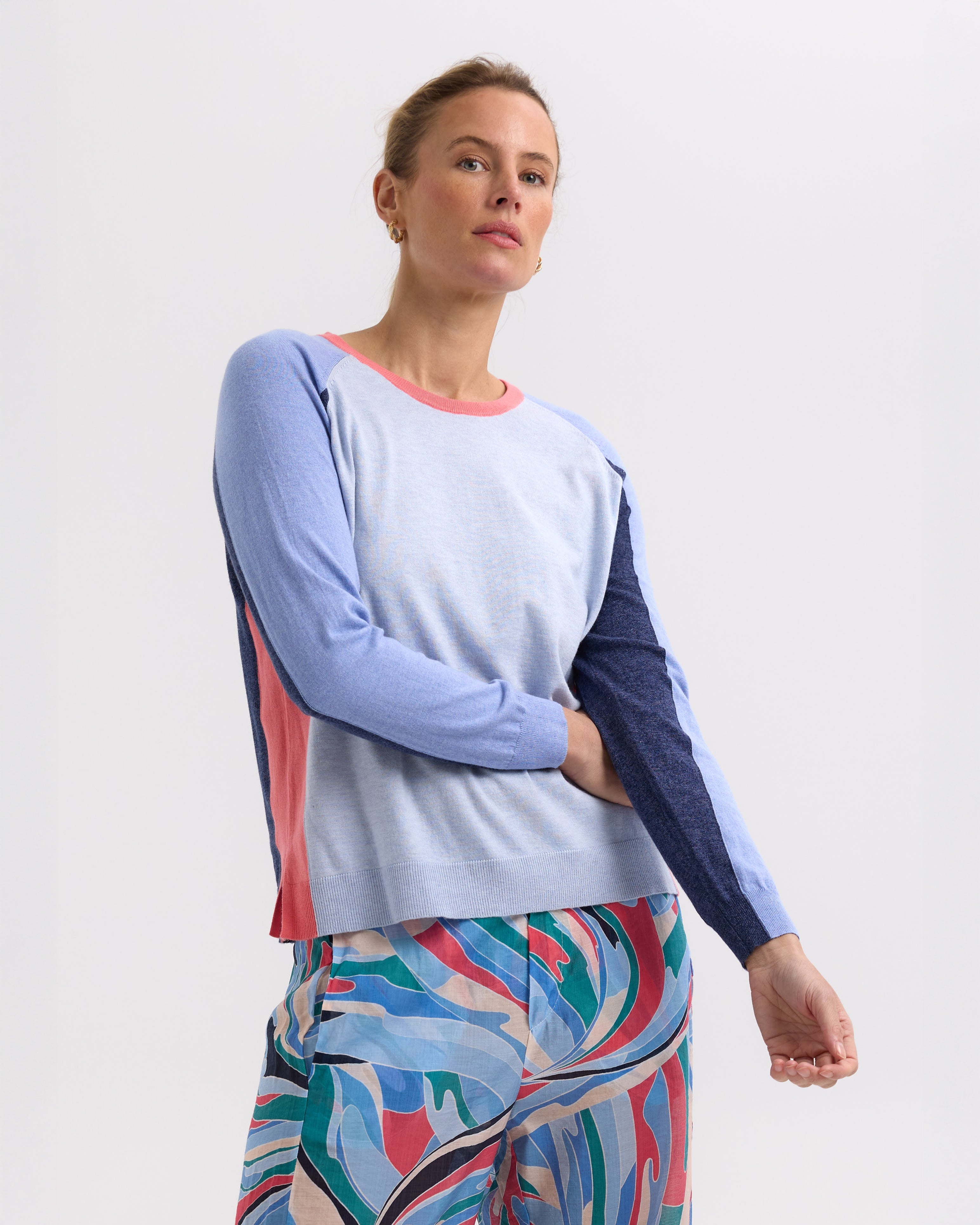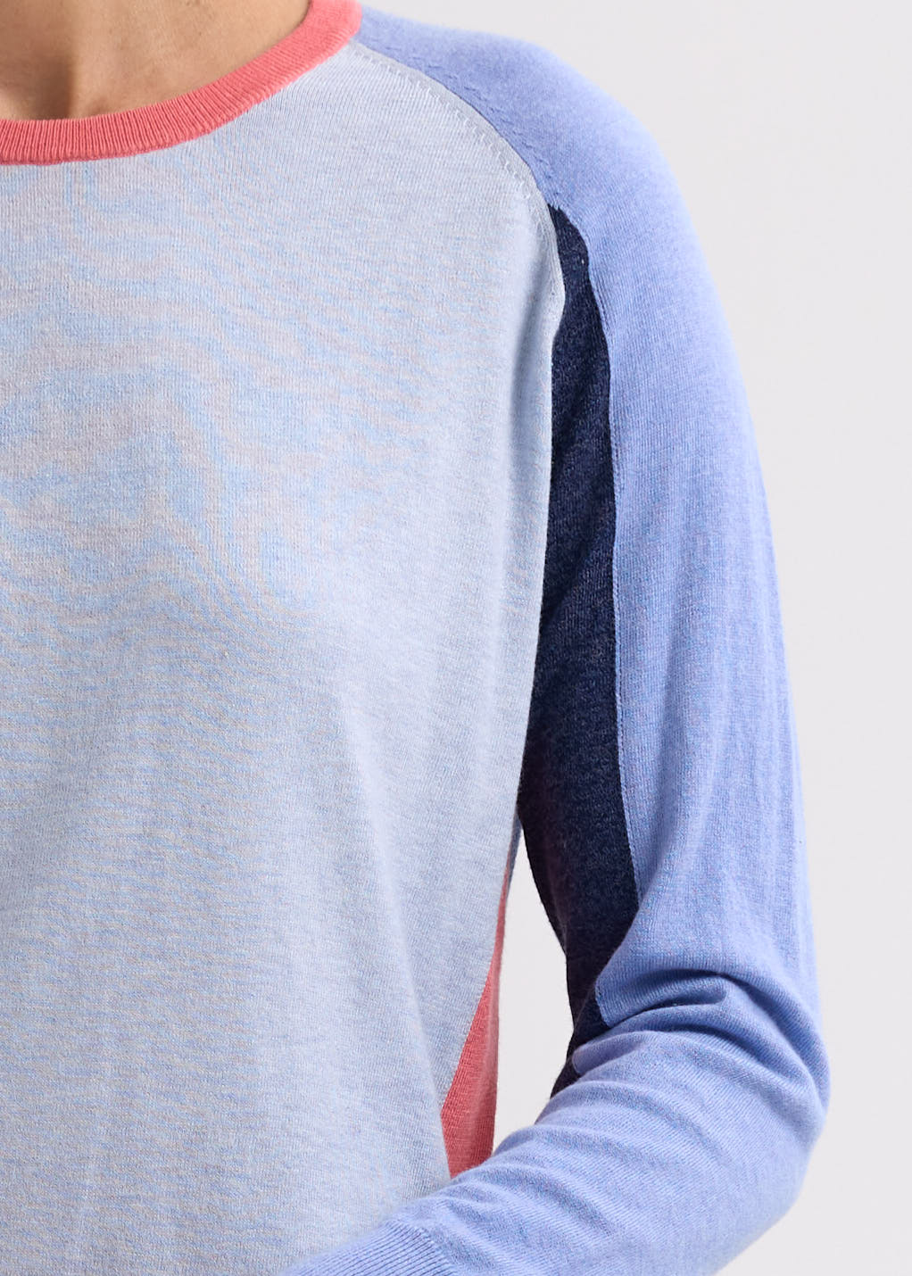 Crafted from a premium cotton-blend knit, this lightweight yet cozy jumper features a relaxed fit and soft blush base that flatters all skin tones. Bold contrast sleeves and dual-tone front and back panels add a fresh, sporty edge, making it the perfect statement piece for off-duty days or laid-back layering. Ribbed cuffs, hem, and neckline complete the look with subtle structure and comfort.