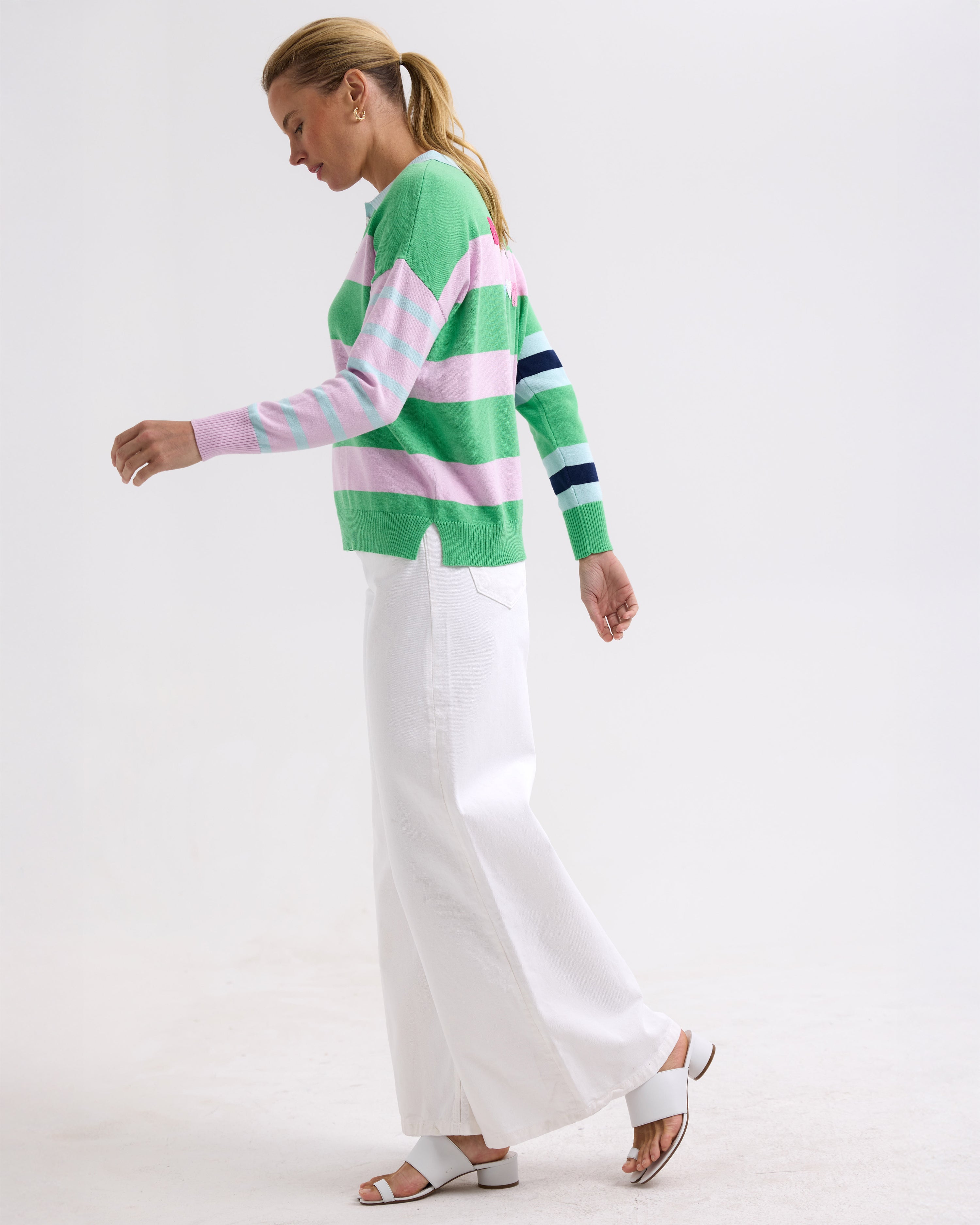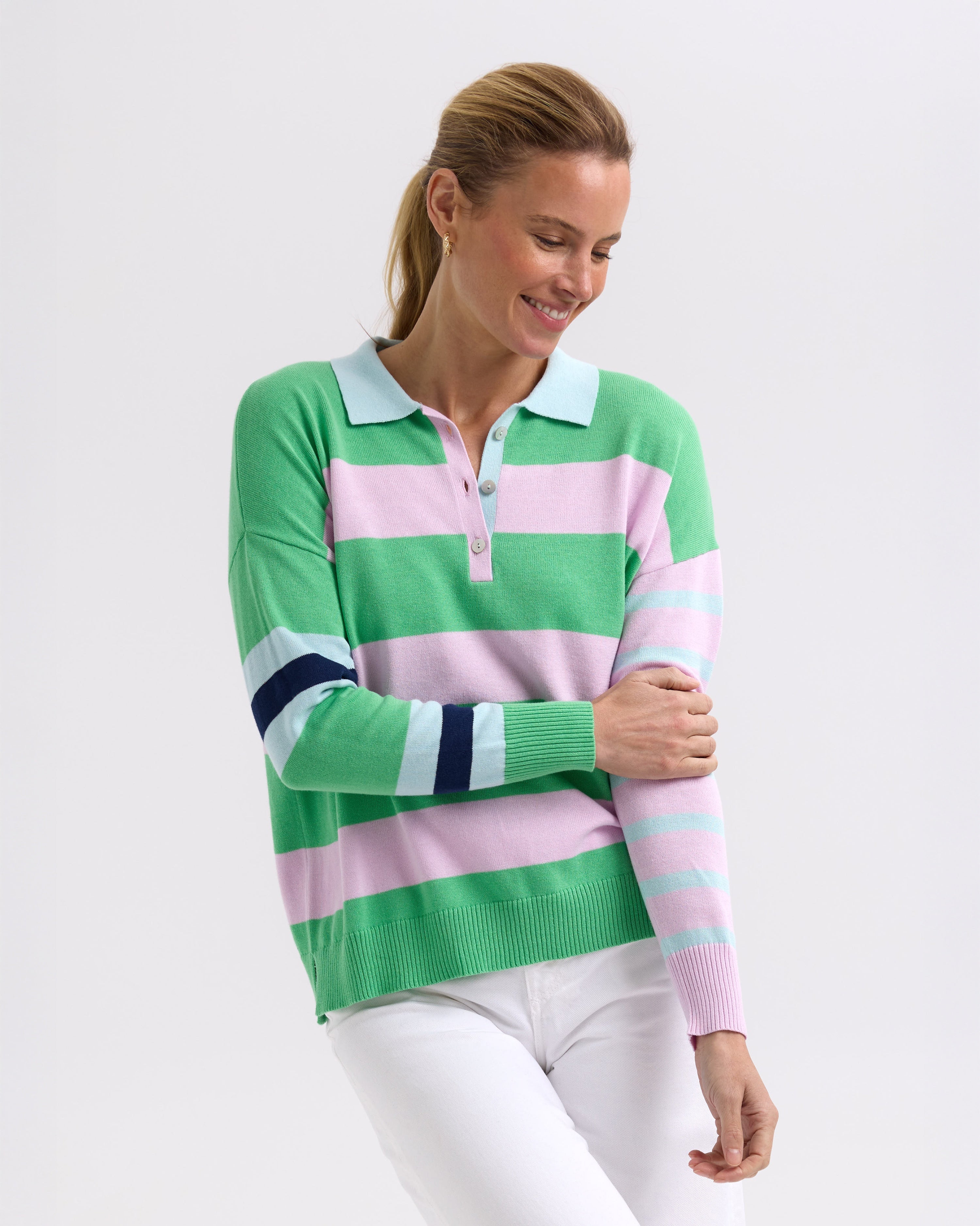 This Zaket & Plover rugby top combines classic cotton knit comfort with a fresh twist of apple green and pink stripes. The standout "blah blah" embroidery on the back adds a playful, unique touch, making it perfect for those who want to express their style confidently. Durable and stylish, it’s an ideal choice for casual wear with a sporty edge.