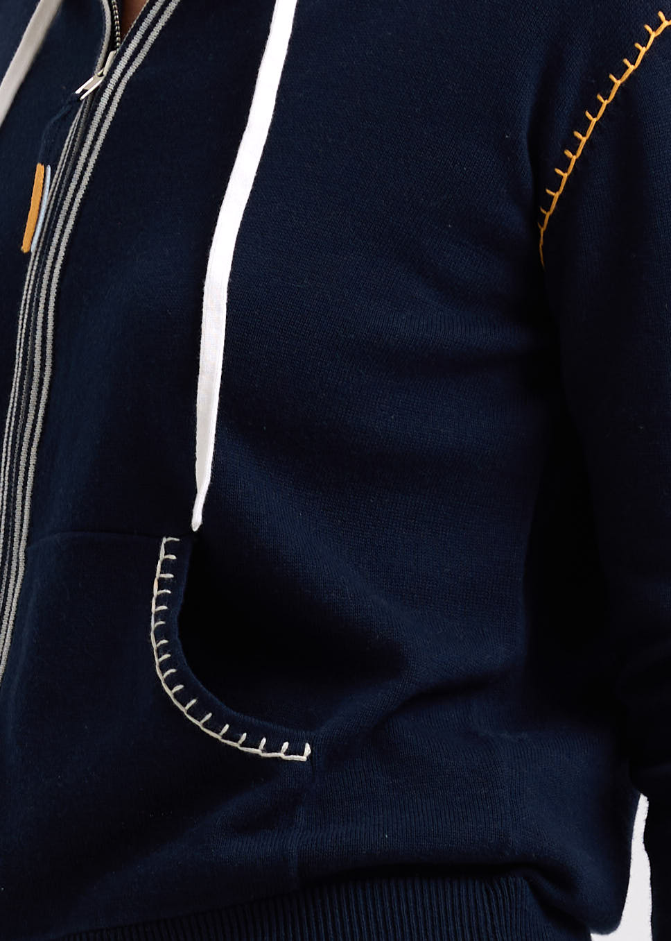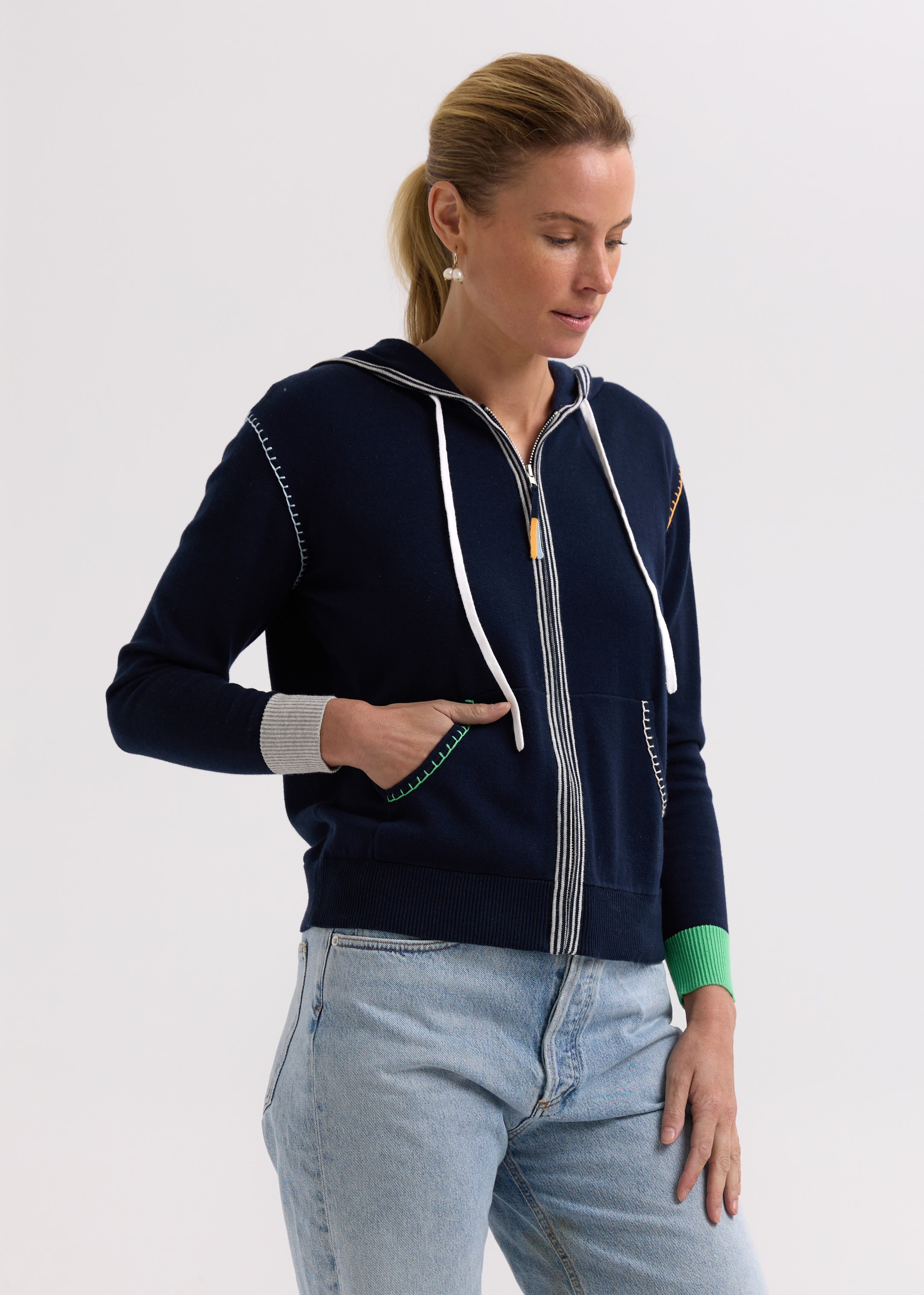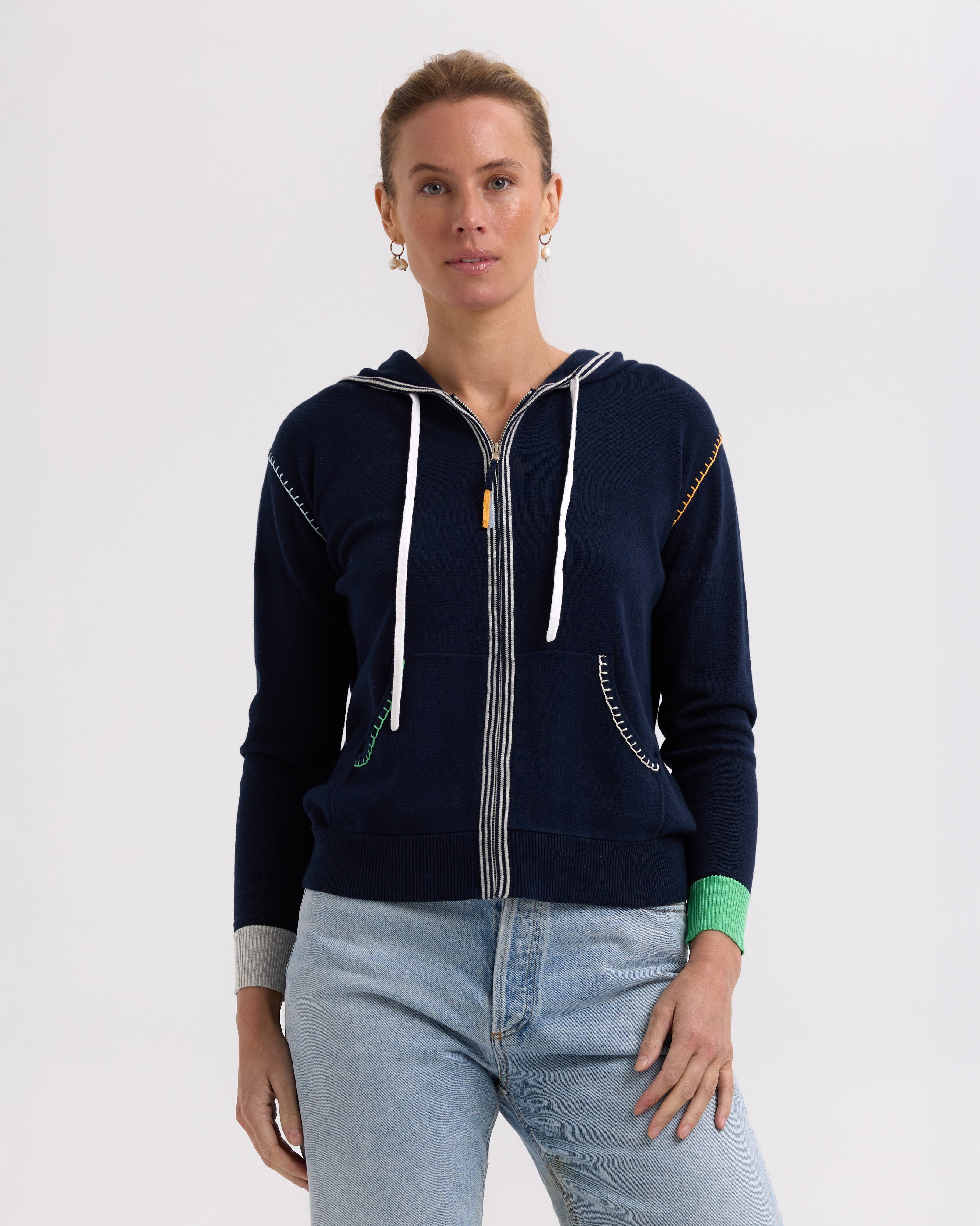 This laid-back zip-up is anything but basic, blending effortless comfort with the label’s signature playful charm. Crafted in a soft navy knit, it features contrast stitching details along the seams and pockets, subtle heart embroidery, and mismatched cuffs in soft grey and vibrant green for a quirky twist. The full zip front, drawstring hood, and front patch pockets give it that lived-in, sporty feel - perfect for layering on the go.