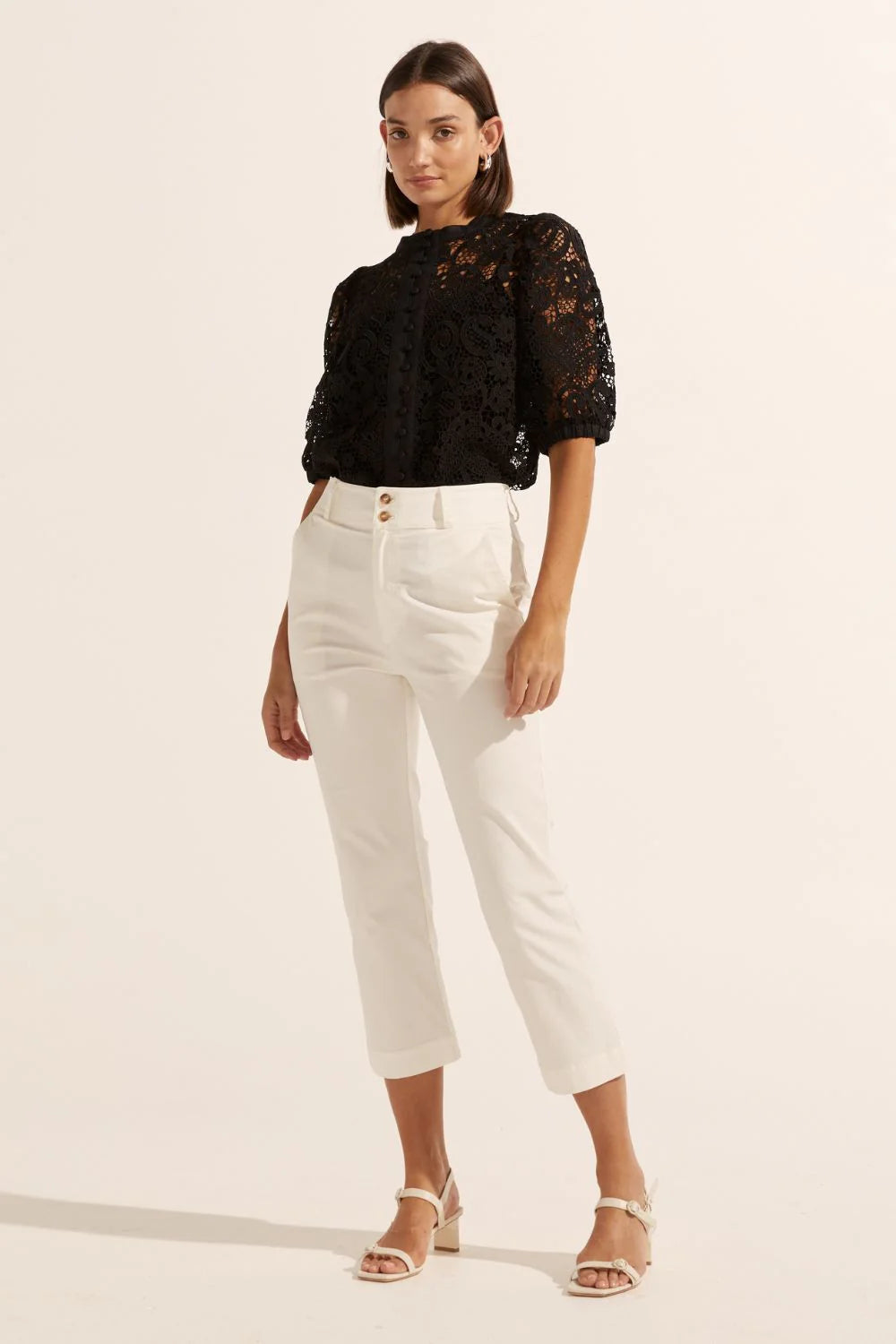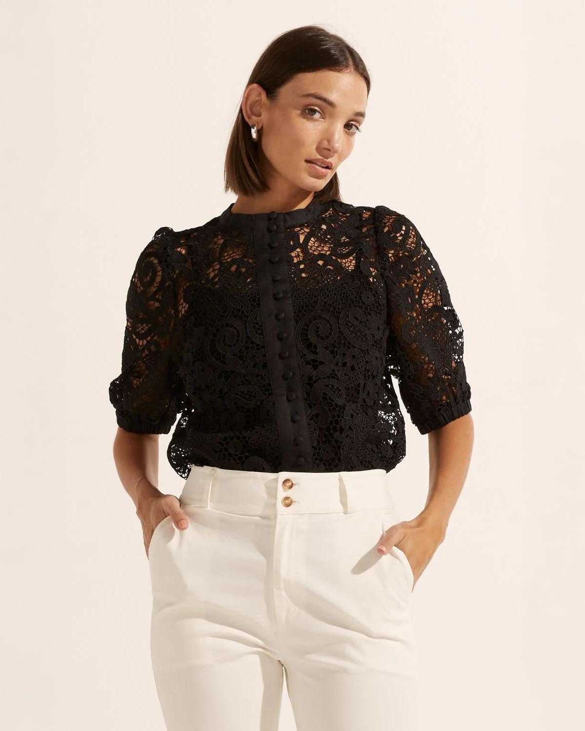 Fresh yet timeless, the Parade embraces modern romanticism. Crafted in lace with floral and paisley motifs, it boasts neat round neckline and covered buttons fasted with rouleau loops.