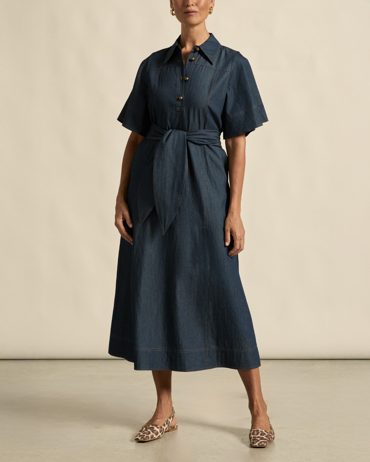 A modern classic with nostalgic touches, the cameo dress is made for versatile, everyday elegance. Flutter sleeves and tan topstitching bring character to a timeless chambray silhouette.