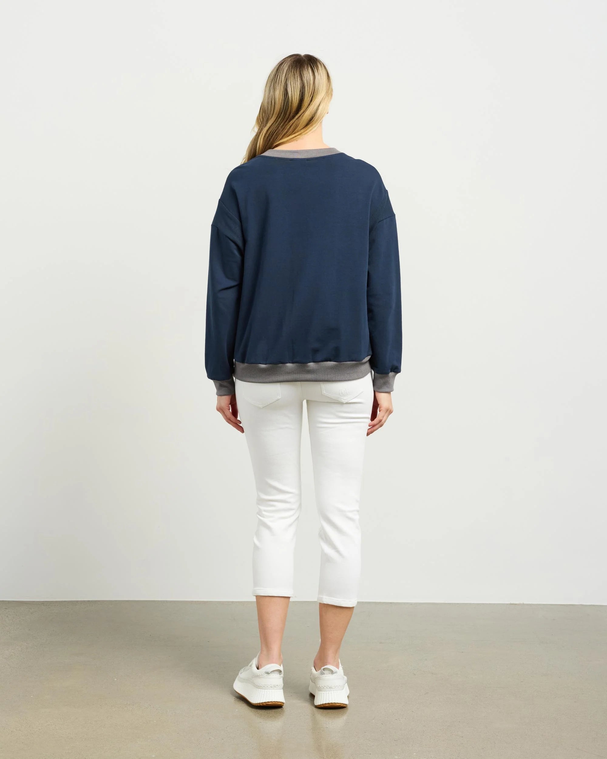 - Contrast rib at neck, cuffs, and hem