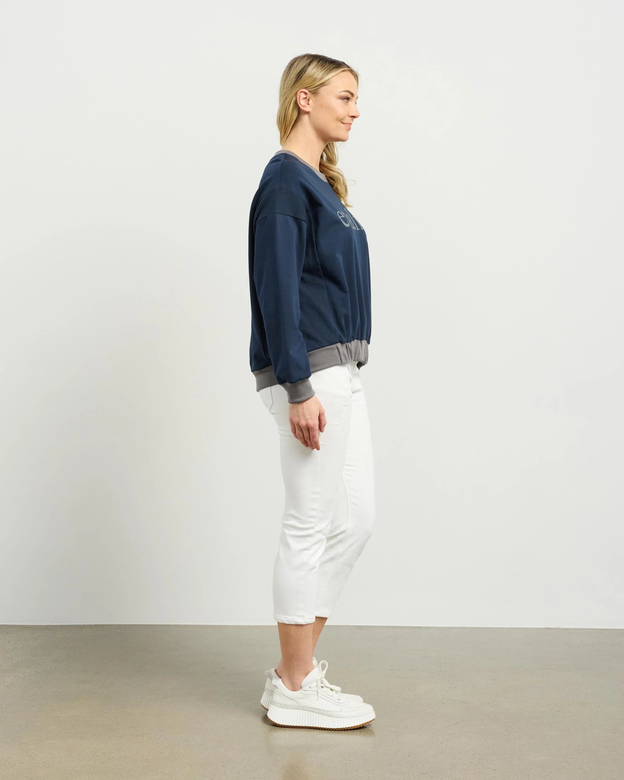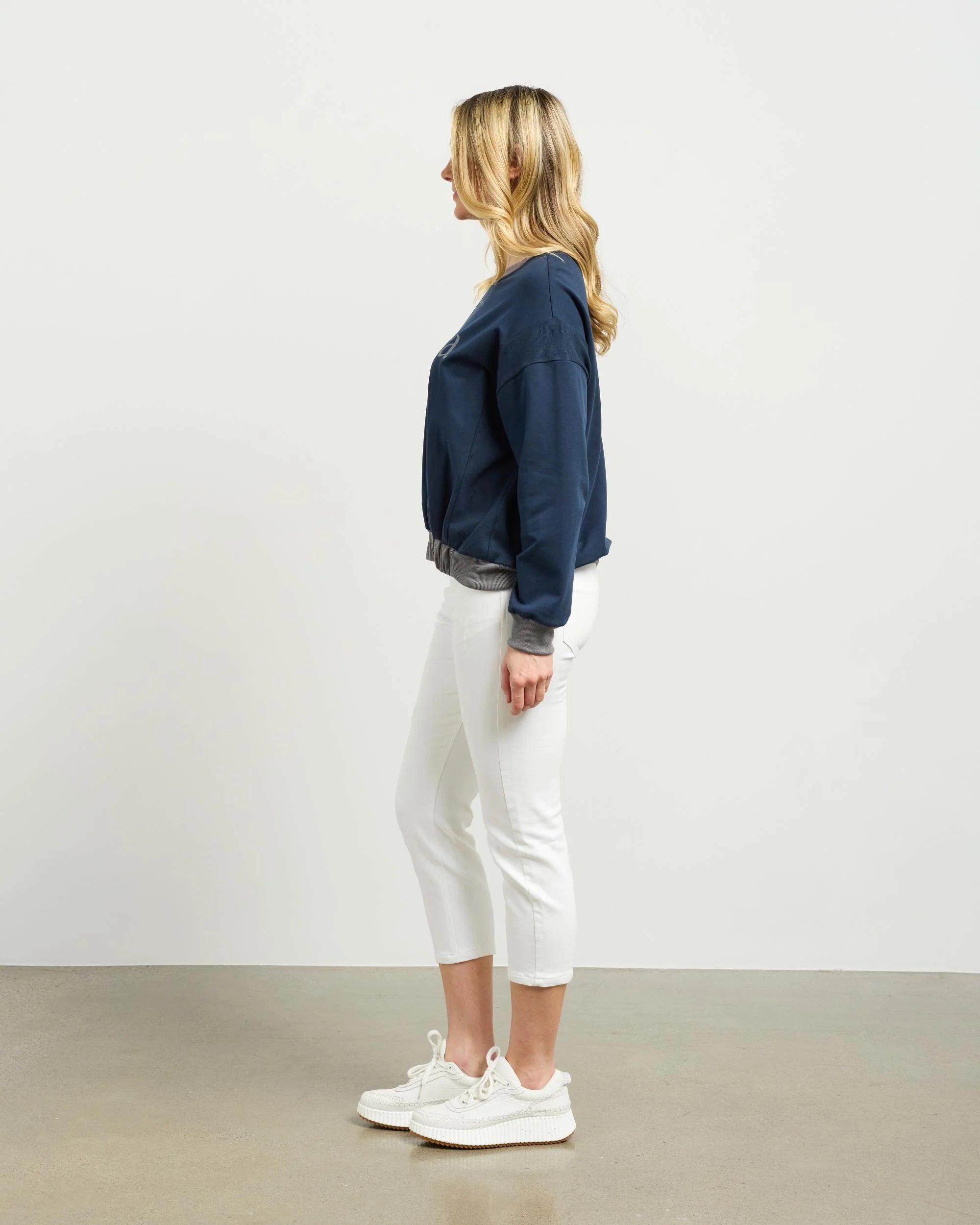 A modern update on a classic sweat. The Boston features contrast rib trim and subtle gathers at the hem for soft shape. A tonal logo print on the front adds a minimalist branded touch.