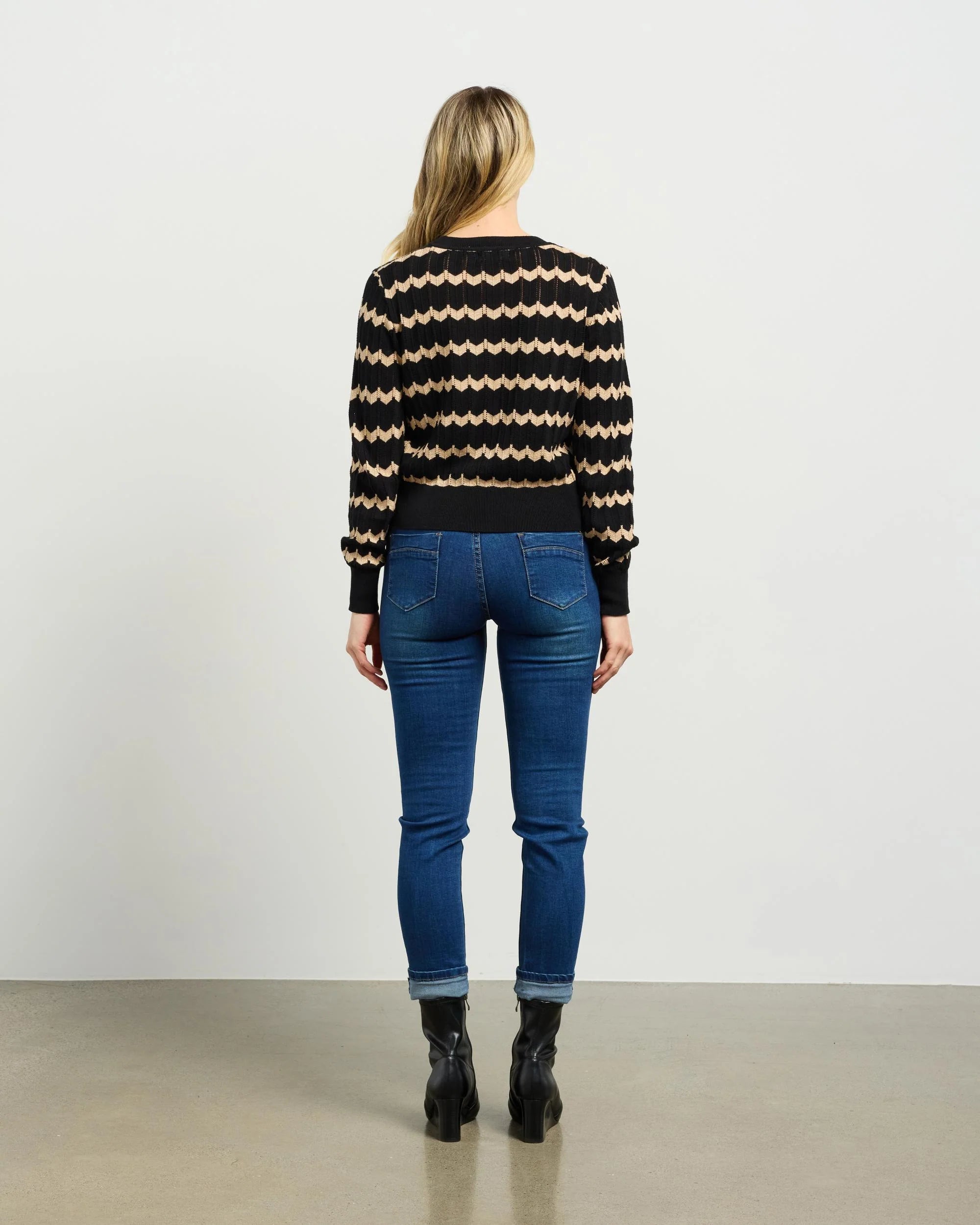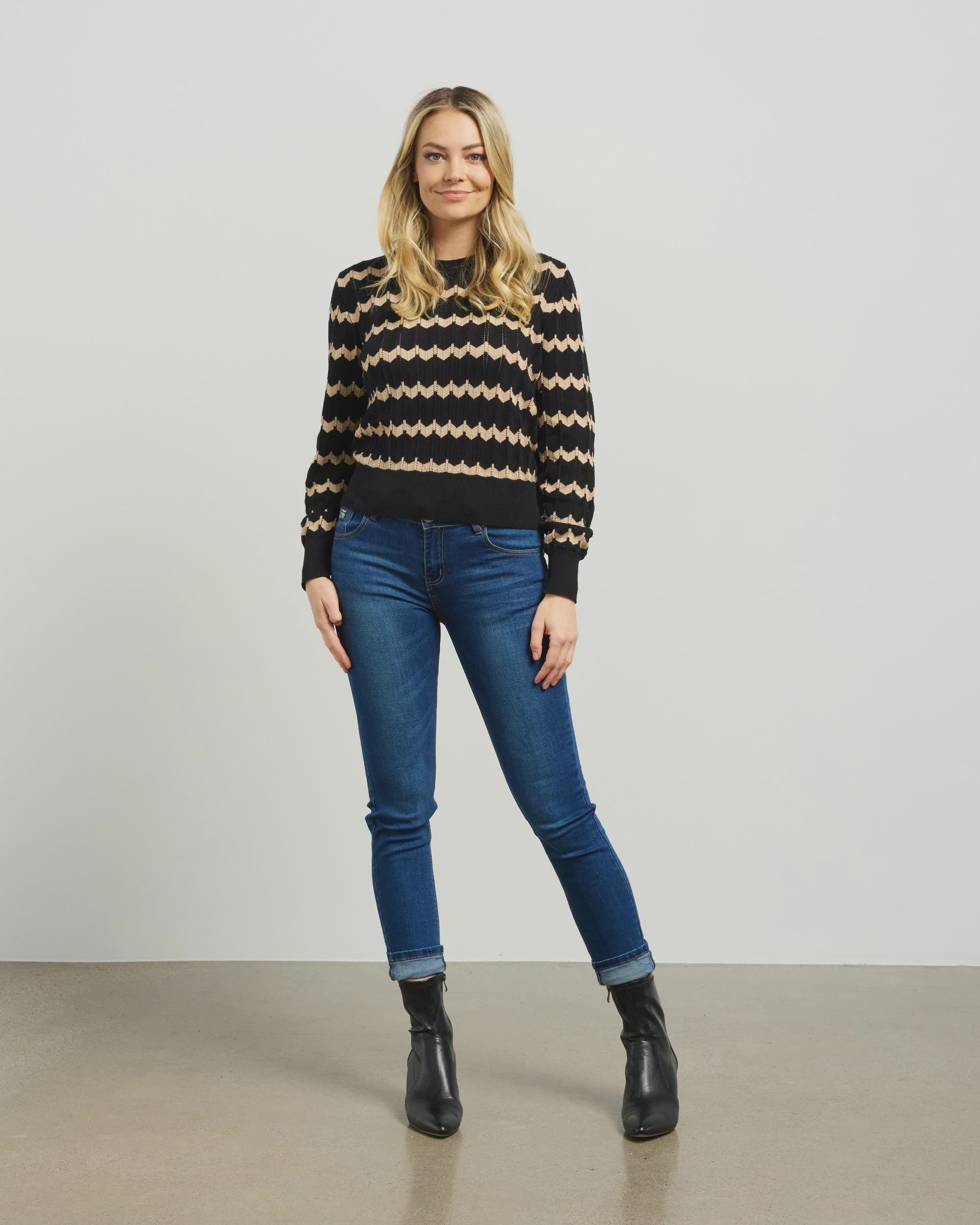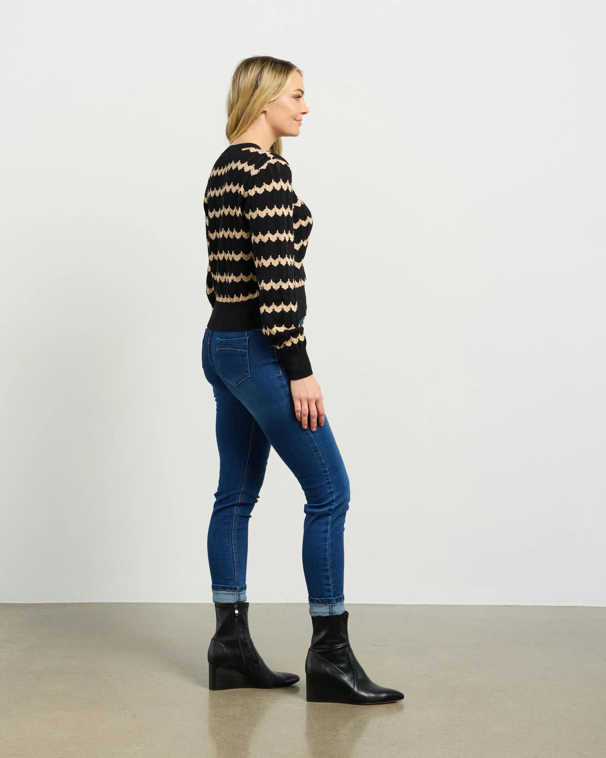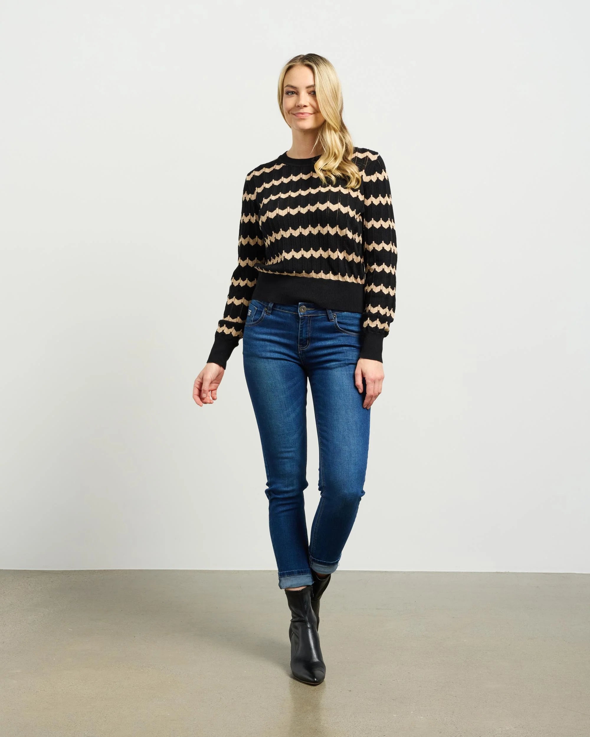 A playful yet polished knit with a striking black and gold lurex zig-zag pattern. This lightweight style features pretty knit stripe detailing, a ribbed waistband, and a flattering shorter length.