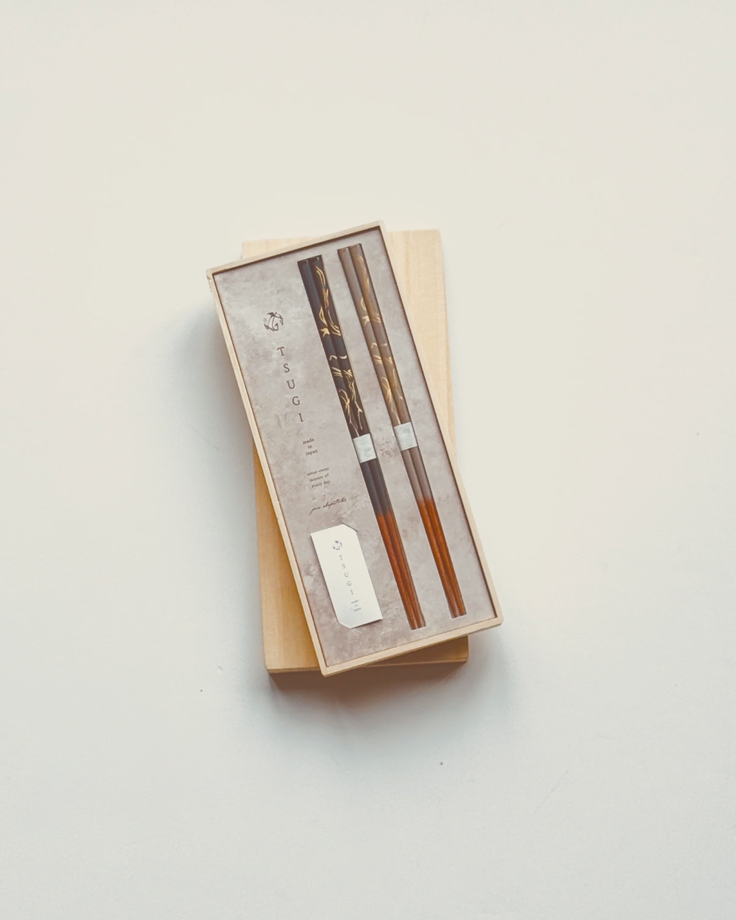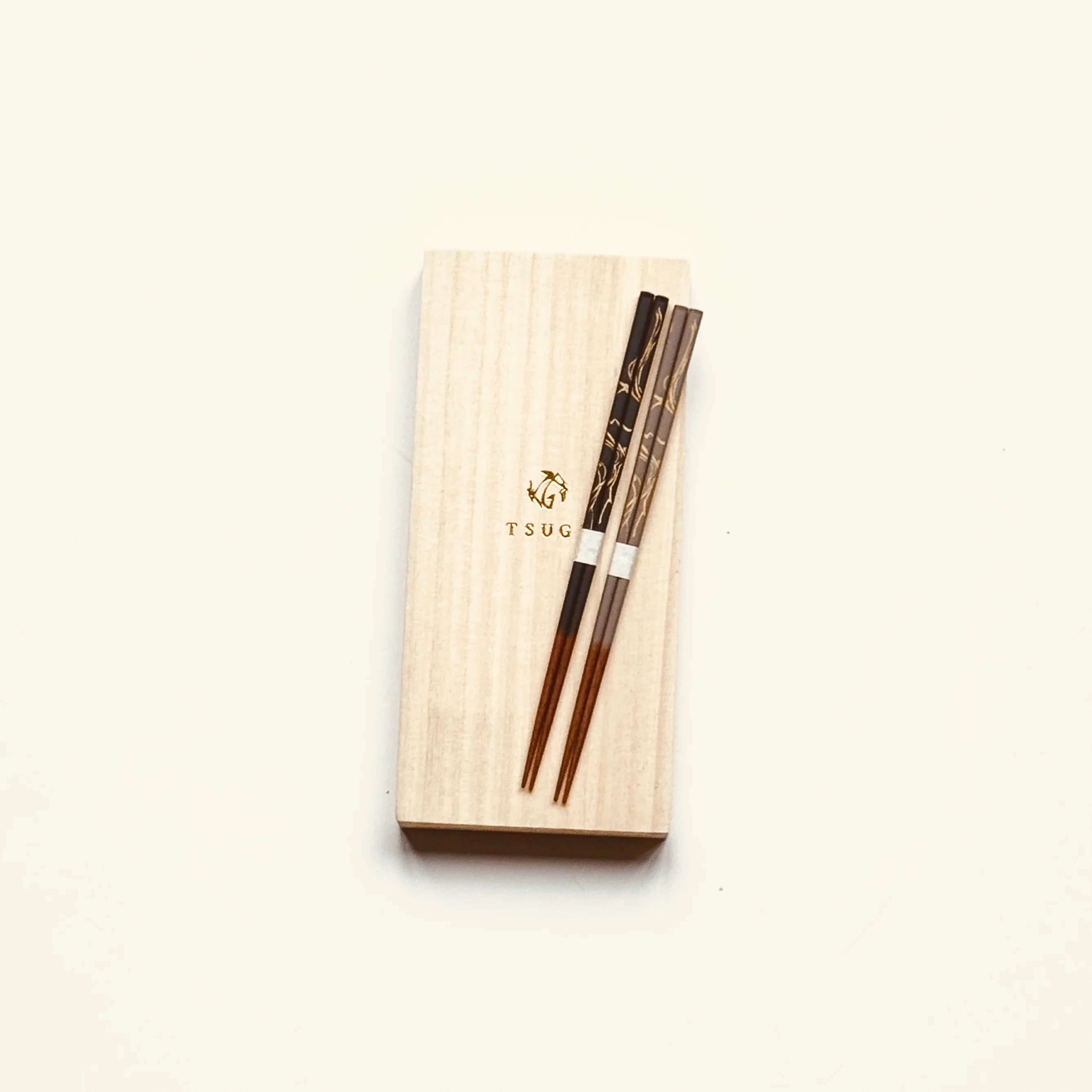 Presented in a paulownia wood box with a foil-stamped logo, this gift set features two pairs of "TSUGI" natural wood chopsticks inspired by the Japanese kintsugi technique, which mends ceramics with gold to highlight their flaws. Their sleek, refined shape and radiant gold seam elegantly enhance the feel in your hands. Crafted from natural wood, the chopsticks include non-slip tips and are dishwasher safe for practical use.