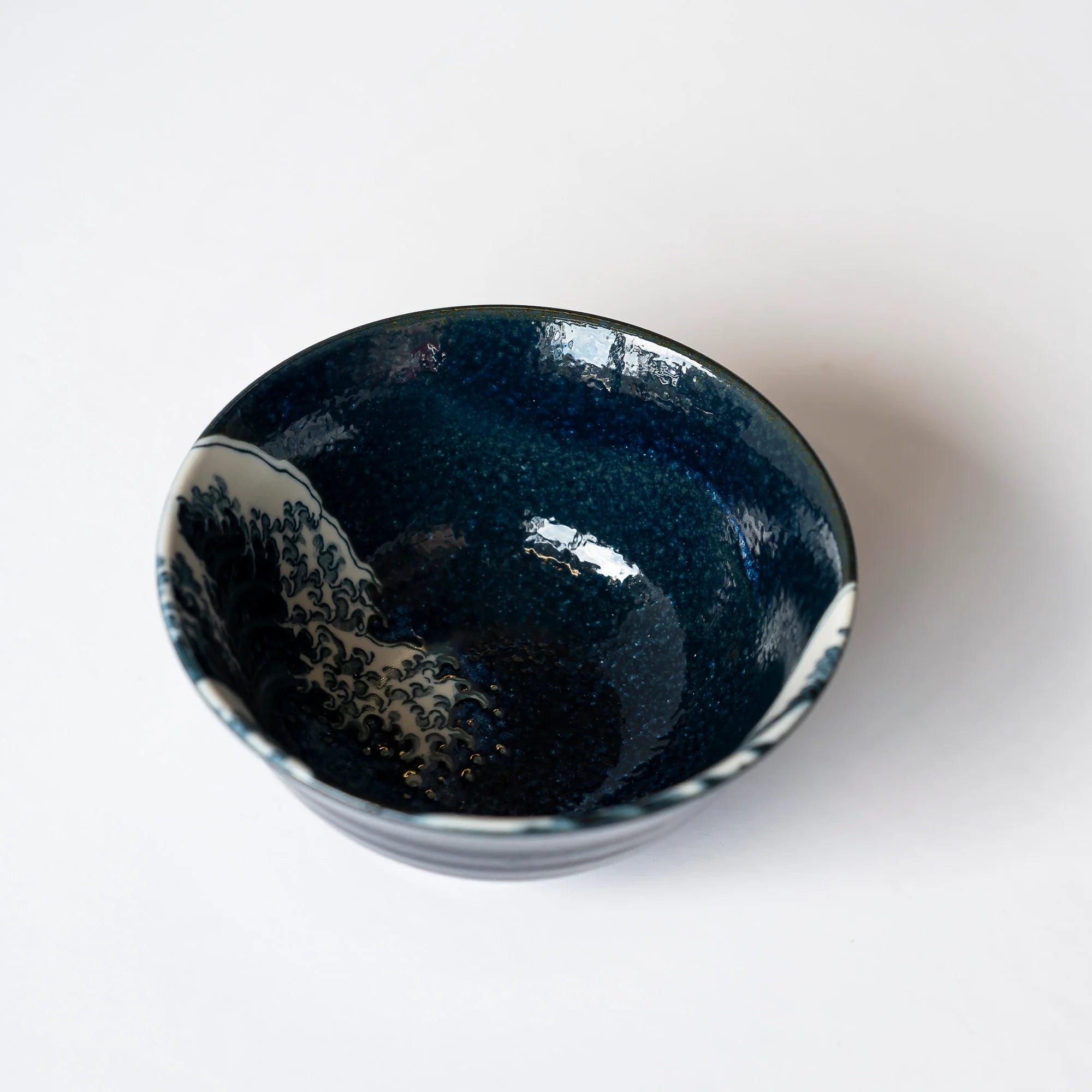 The Great Wave off Kanagawa depicts three boats moving through a storm-tossed sea, with a large, cresting wave in the center and Mount Fuji visible in the background.