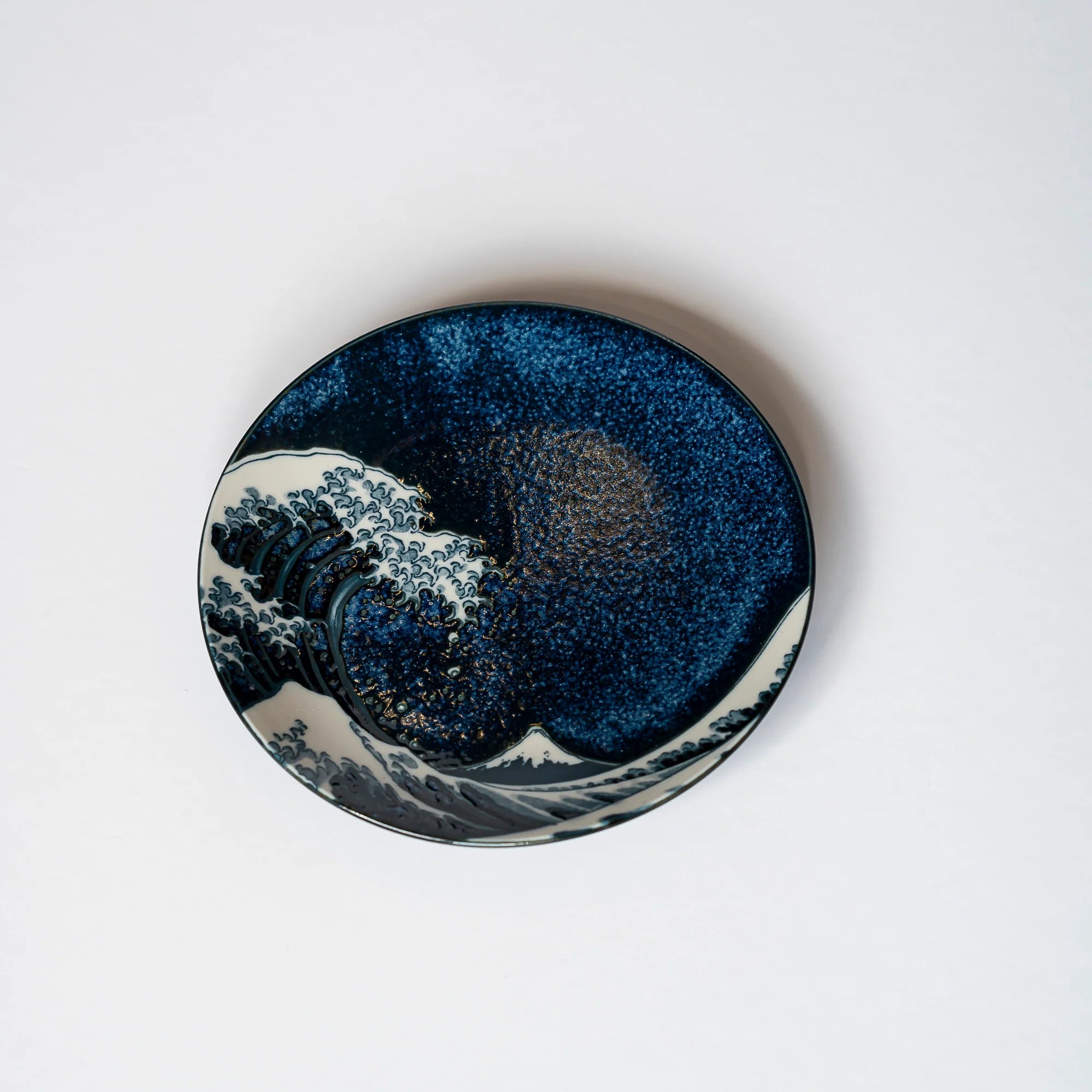 The Great Wave off Kanagawa depicts three boats moving through a storm-tossed sea, with a large, cresting wave in the center and Mount Fuji visible in the background.
