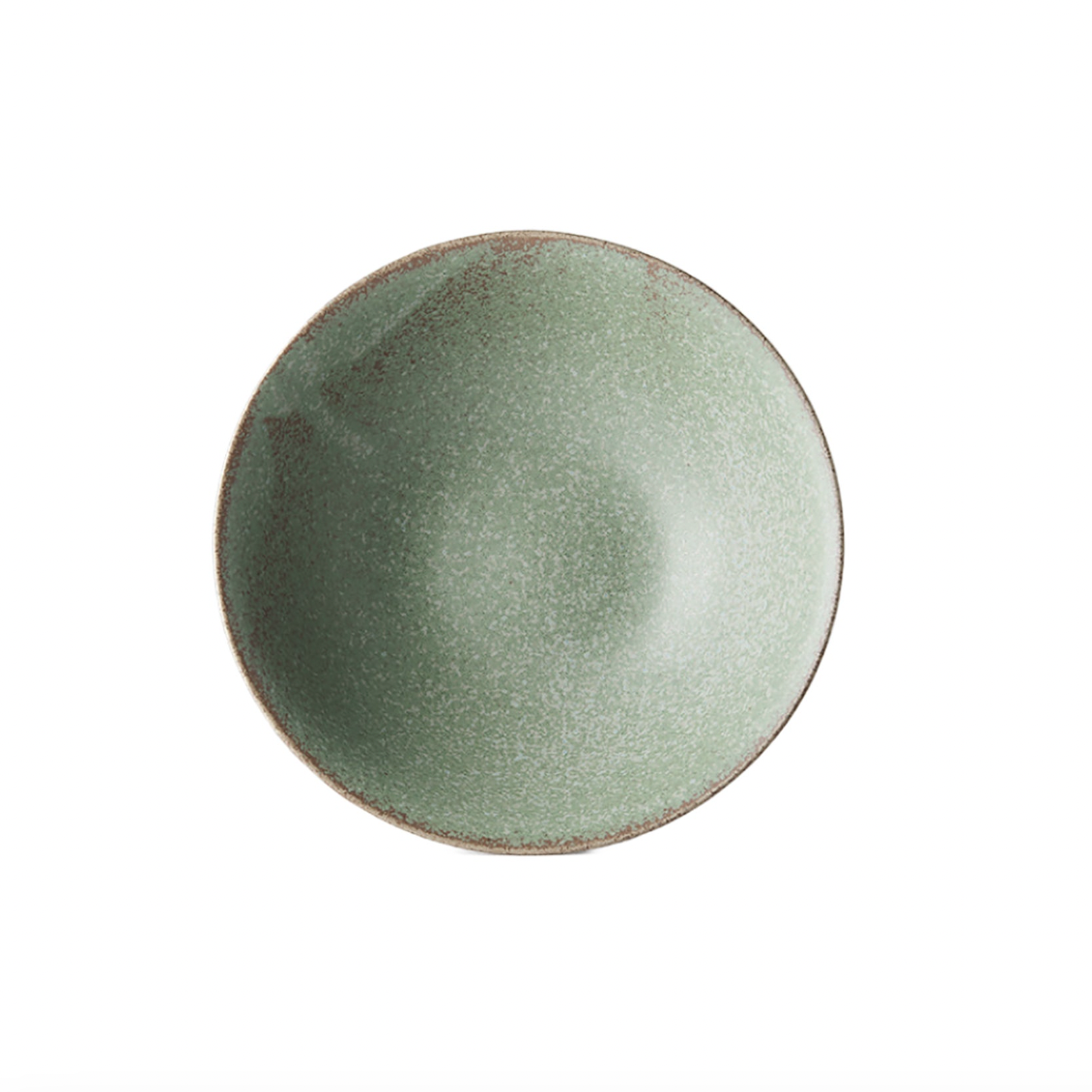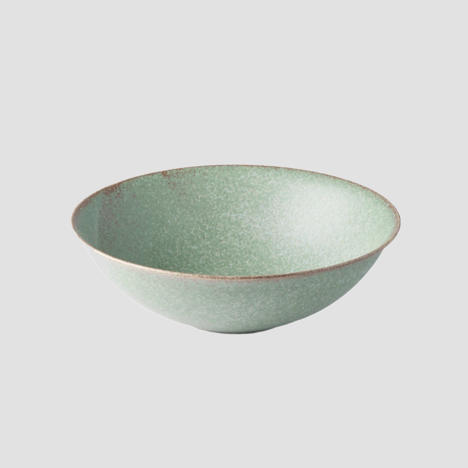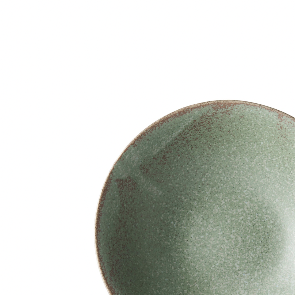 The green fade glaze features a lush, forest green tone with button-flower blue highlights and an edge of light brown. Each piece has a unique dappled pattern determined by its position in the kiln during the firing process. This beautifully shaped bowl can be used for noodles, soups, salads, pasta and risottos.
