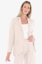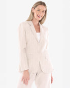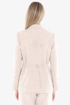 Soft Pinstripe Jacket, one button, three pocket, long sleeve D Ring tie back detail.