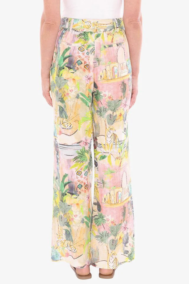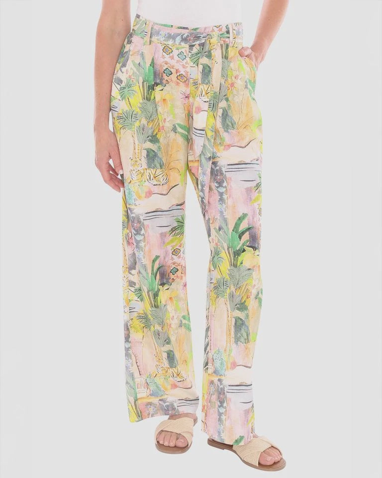 The Tiger Island Printed Tie Waist Pant features two side pockets, softly pleated front, fly front, straight leg, elastic back, self tie.