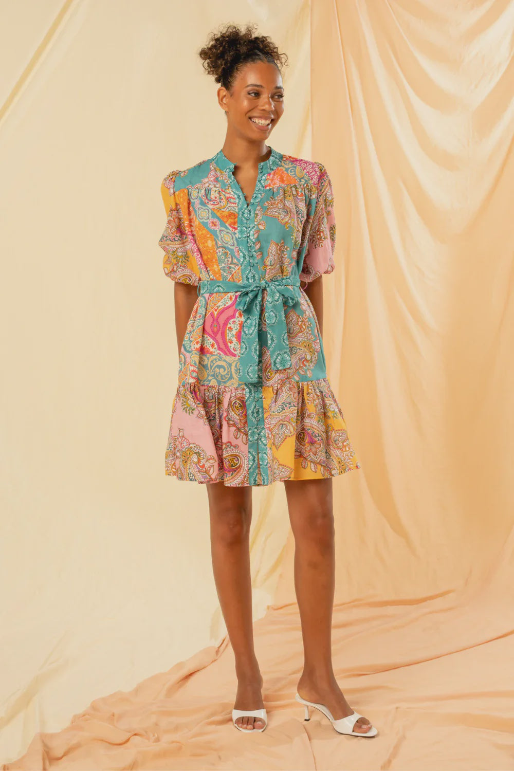 Discover the Dora Mini Shirt Dress by Kachel - where chic meets versatility. Featuring a detachable belt in a matching print, functional button placket, and voluminous puff sleeves. Its mini length and classic round neckline, paired with lightweight, slightly textured fabric, ensure comfort in style.