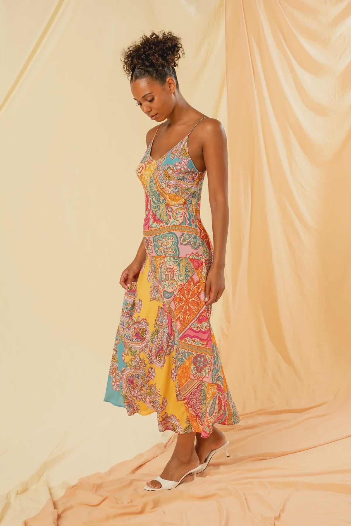 Elevate your style with the Indie Maxi Slip Dress by Kachel. Crafted from a luxurious viscose silk blend, it exudes sophistication. The V-neckline and deep V back create a timeless silhouette, framed by delicate thin shoulder straps. The fresh summer print adds enchantment, perfect for weddings or summer parties.