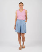 The Naomi Short is an easy warm-weather essential with a soft, drapey feel and denim-inspired look. Designed in a relaxed wide leg fit with crisp white contrast stitching and slash pockets, it's a comfortable option for everyday styling.