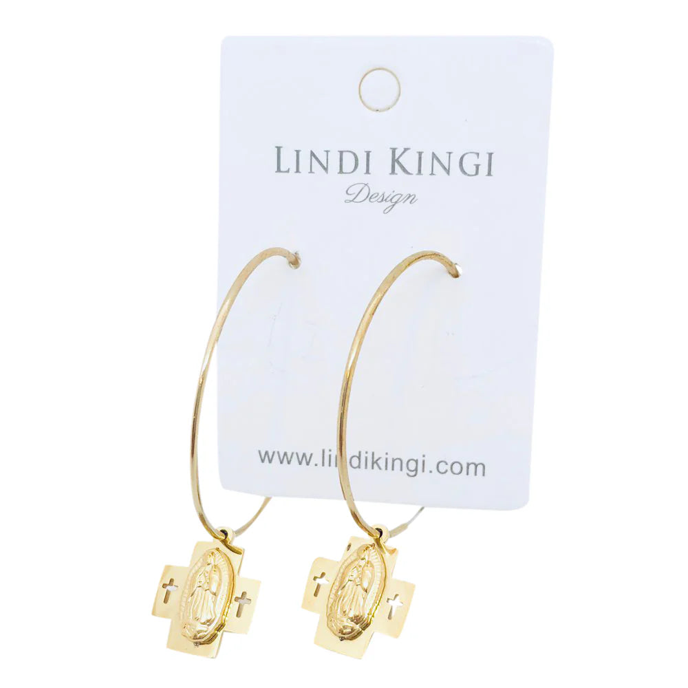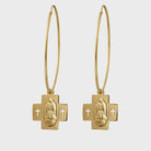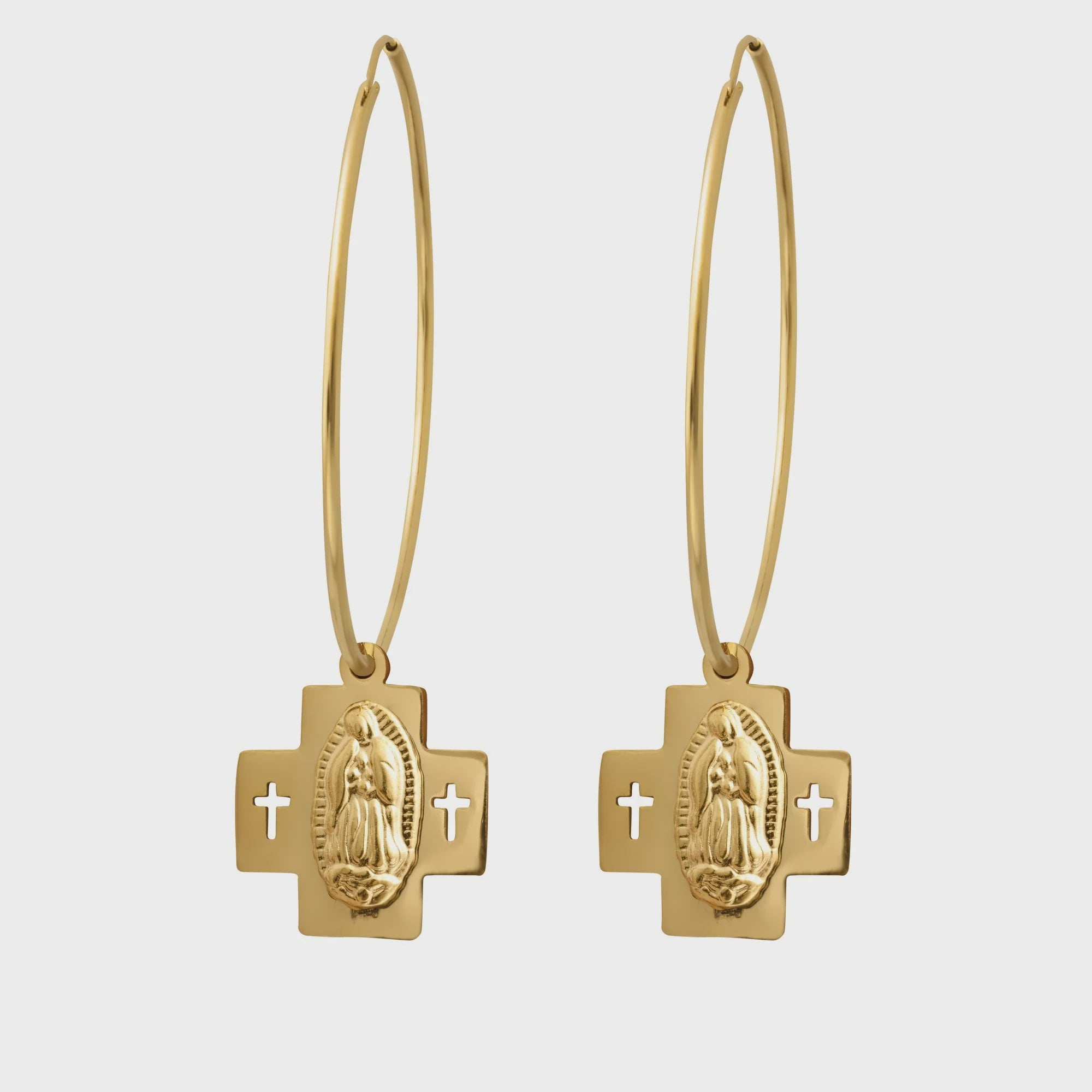 These gorgeous gold hoop earrings are essential for this season! The saint charm with double cross detailing is sure to get you compliments.