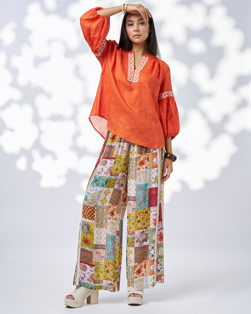 Ramie blouse with a V-neckline, featuring contrast embroidery detail around neckline and sleeve panels. Sleeves gather into a turned back elasticated cuff.
