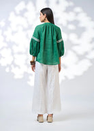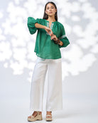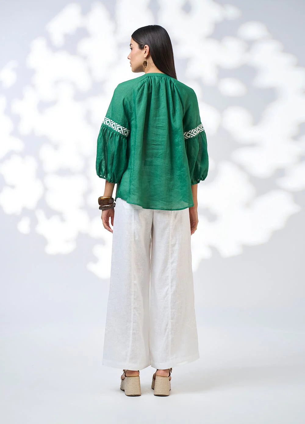 Ramie blouse with a V-neckline, featuring contrast embroidery detail around neckline and sleeve panels. Sleeves gather into a turned back elasticated cuff.