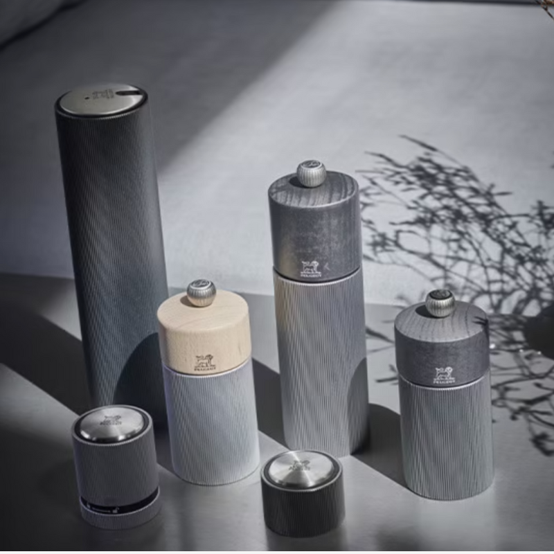 The striated aluminum body and natural wood top reflect the Scandinavian inspiration behind this 18cm Line salt mill. It offers a stylish combination of materials and a superb graphical effect.