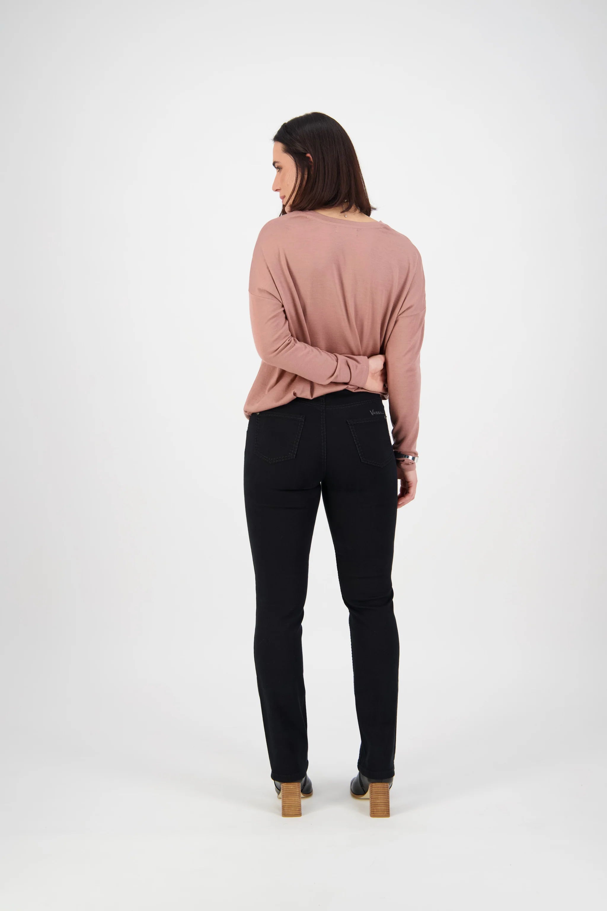 'Vassalli' embroidery above wearers right-hand back pocket