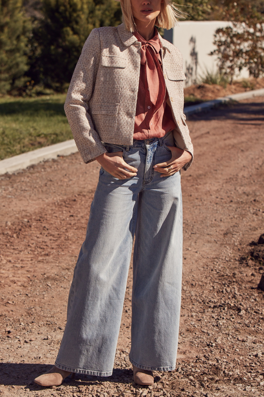 With its cropped silhouette and unique boucle texture, the Zoe Kratzmann Adjoin Jacket blends vintage elegance with contemporary luminosity. textured red threads create a sophisticated visual, while the neat collar and curved pocket flaps add refined femininity.
